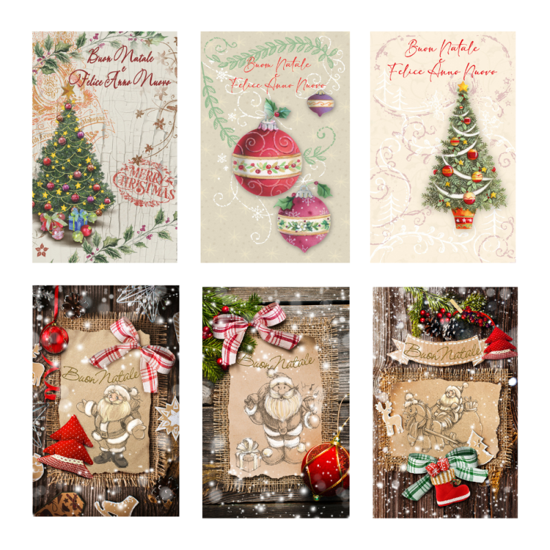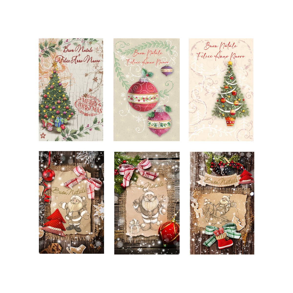 Biglietti Buon Natale con soggetti natalizi in confezione da 6 pezzi assortiti.