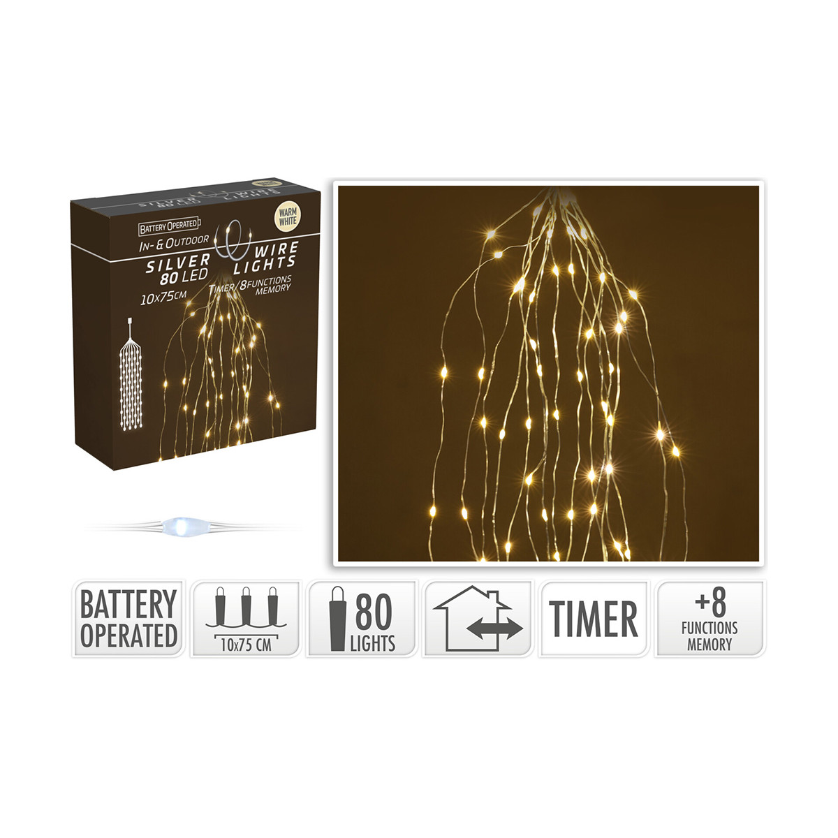Cascata di led a filo. Fili argento e luce calda. Lunghezza di 80cm. Ideali da utilizzare sia indoor che outdoor, come decorazione di negozi e locali ma anche per allestire e illuminare giardini.