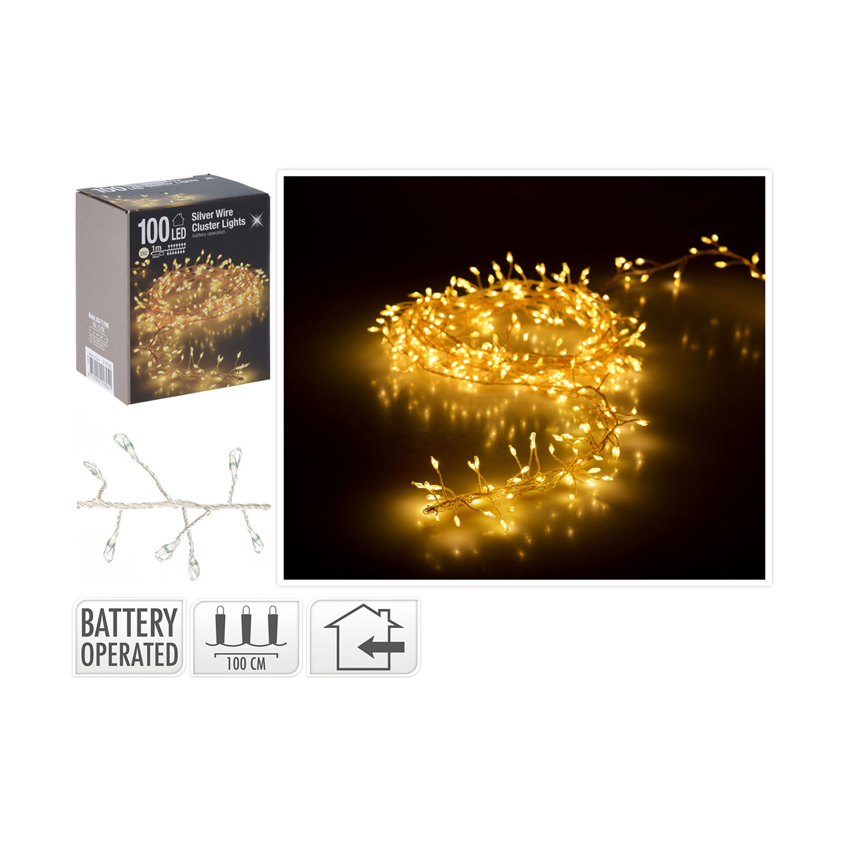 Fascio di 100 Luci Led Calde a Grappolo. Ad uso interno e con cavo argentato, sono la scelta ideale per allestimenti professionali di vetrine, punti vendita e ristoranti. Prezzo al singolo pezzo, iva e trasporto esclusi.