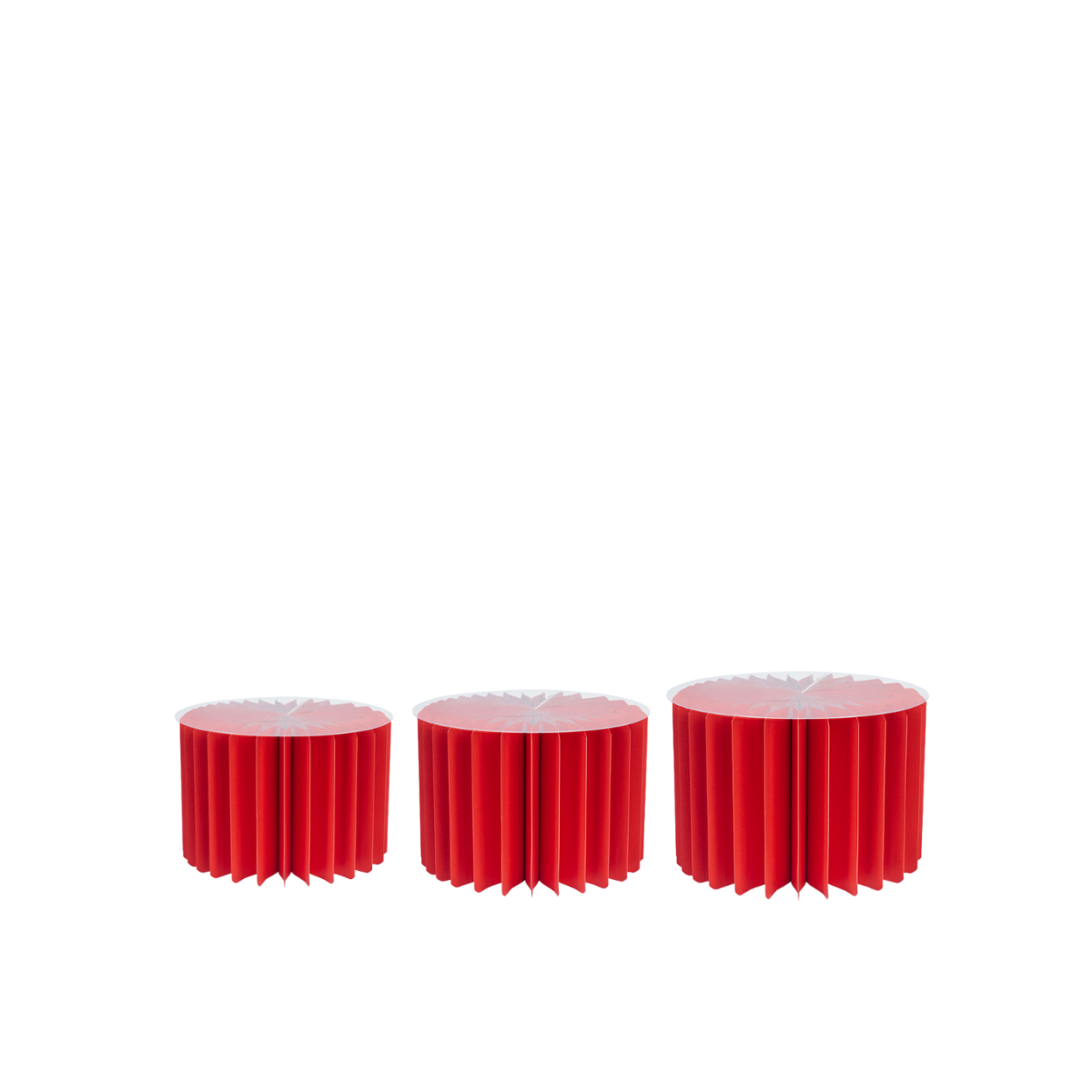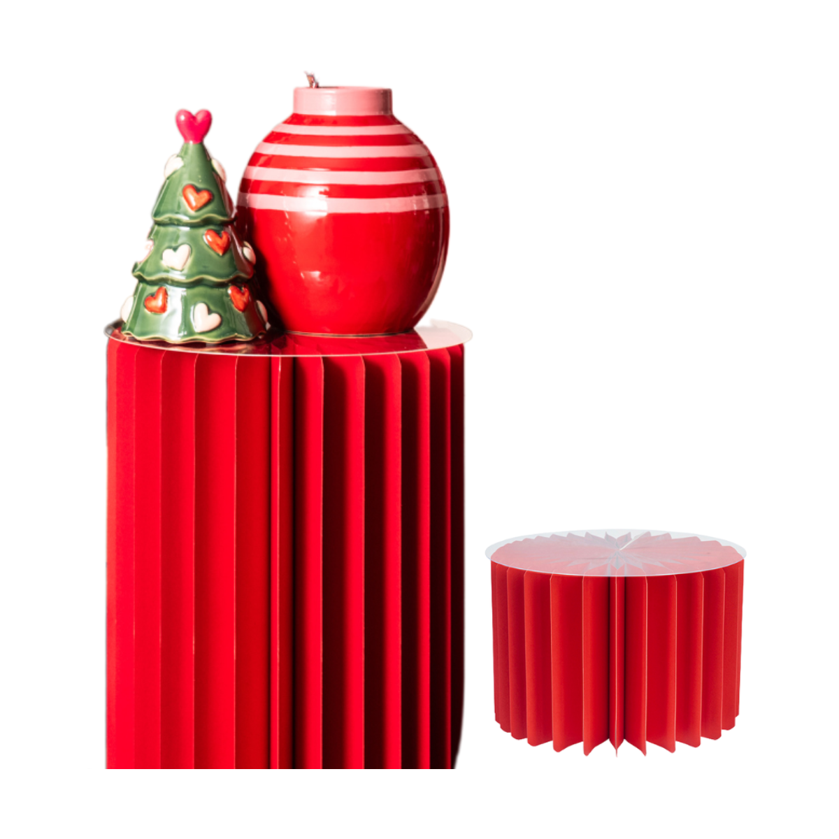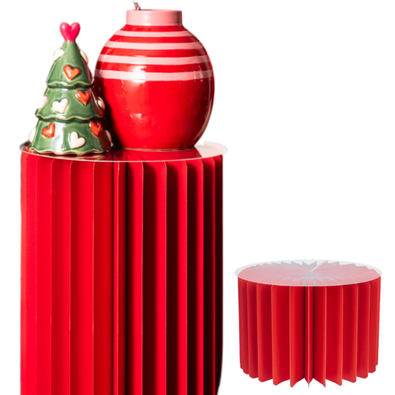 Alzata plissettata in carta rossa con piano di appoggio trasparente. Ottima come espositore per negozi e vetrine.