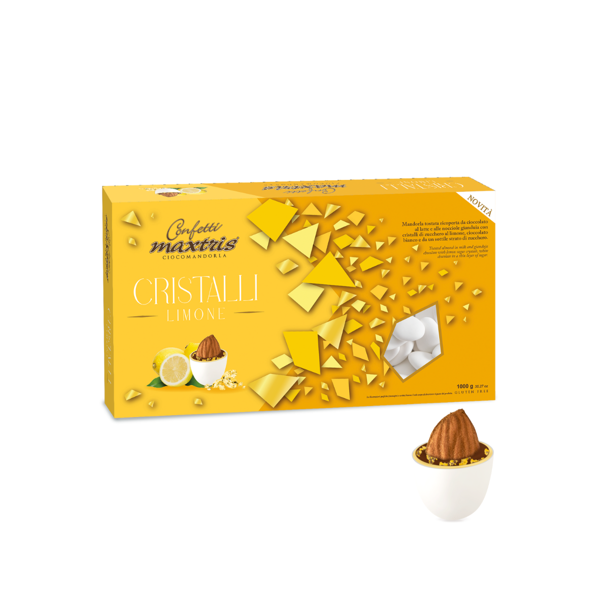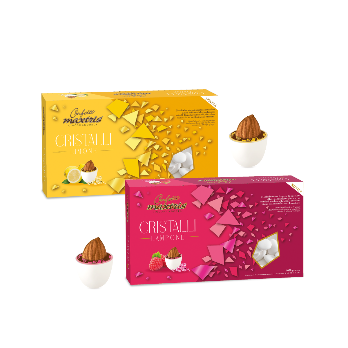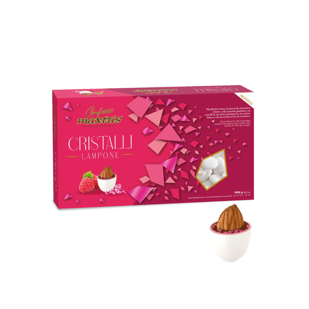 Maxtris Cristalli al Lampone nasce dall’incontro tra una mandorla tostata e un doppio rivestimento di cioccolato al latte e cioccolato bianco, arricchito da cristalli di zucchero aromatizzati al lampone e limone. Il risultato è un confetto moderno e sorprendente, in cui la dolcezza del cioccolato viene vivacizzata da una nota fruttata intensa.