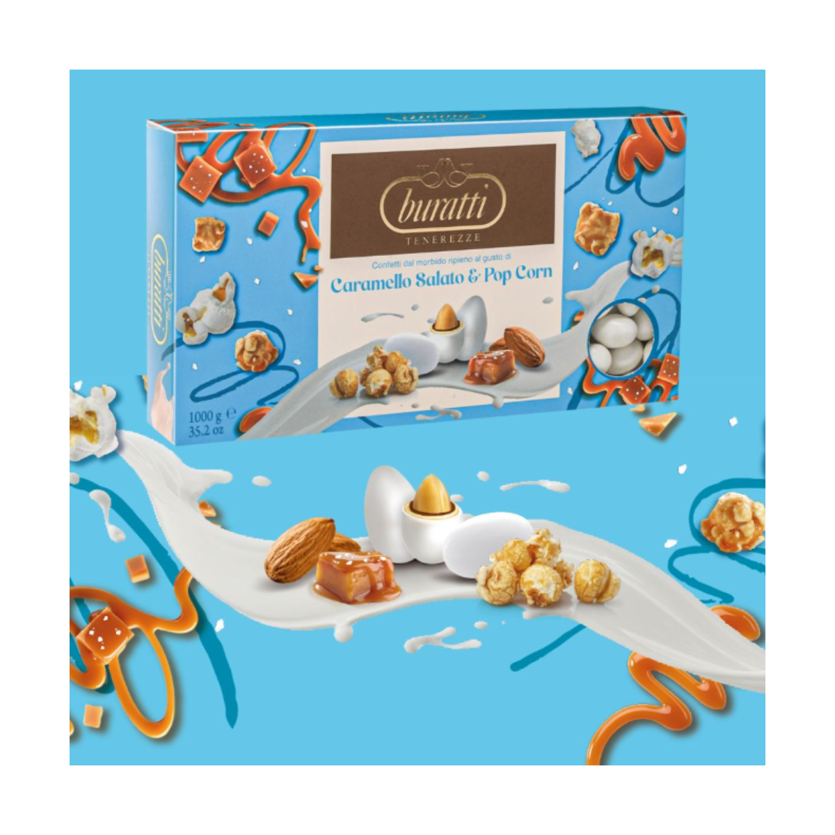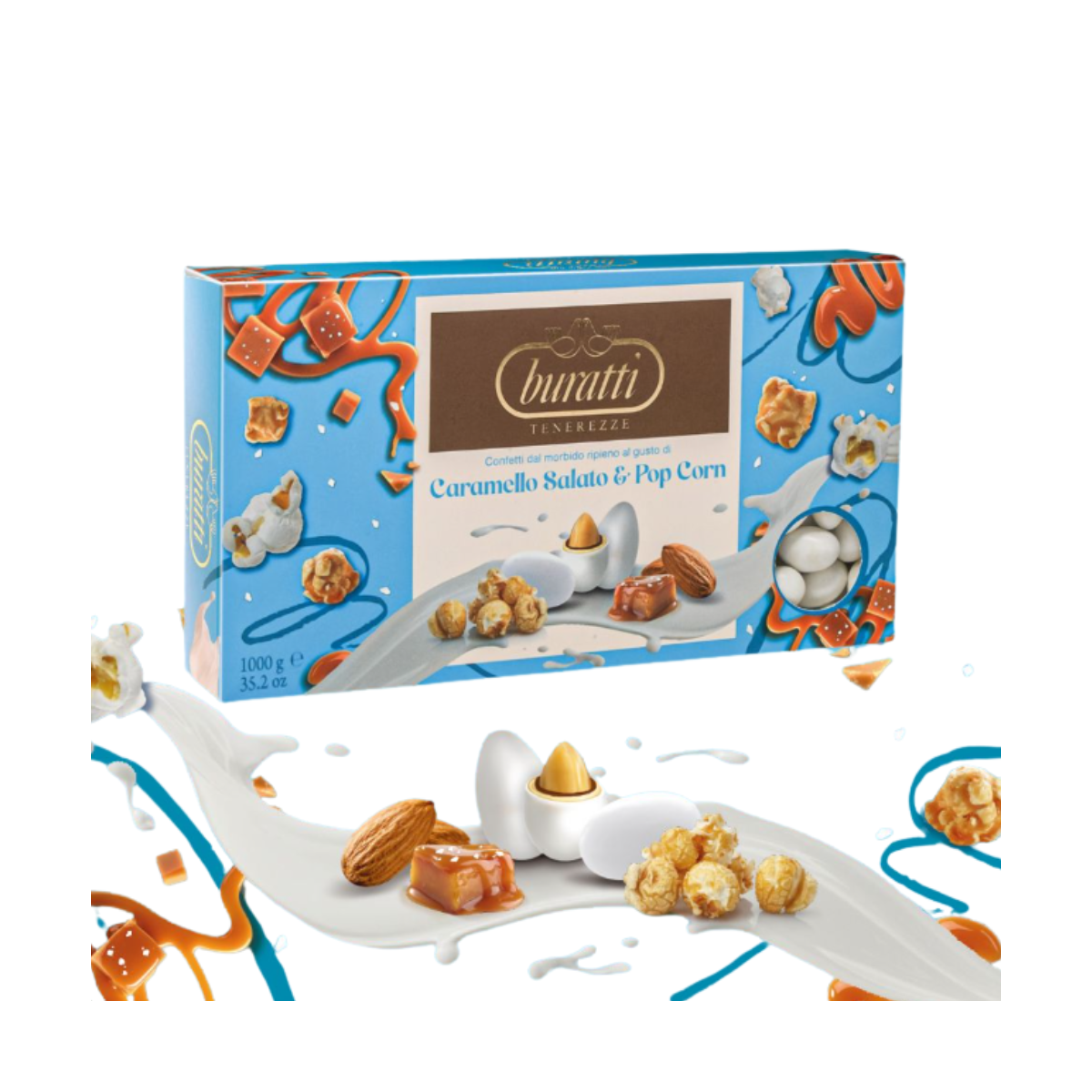 Mandorle tostate ripiene di cioccolato al latte e cioccolato bianco, con note di caramello salato e pop corn, confettate con rivestimento croccante.