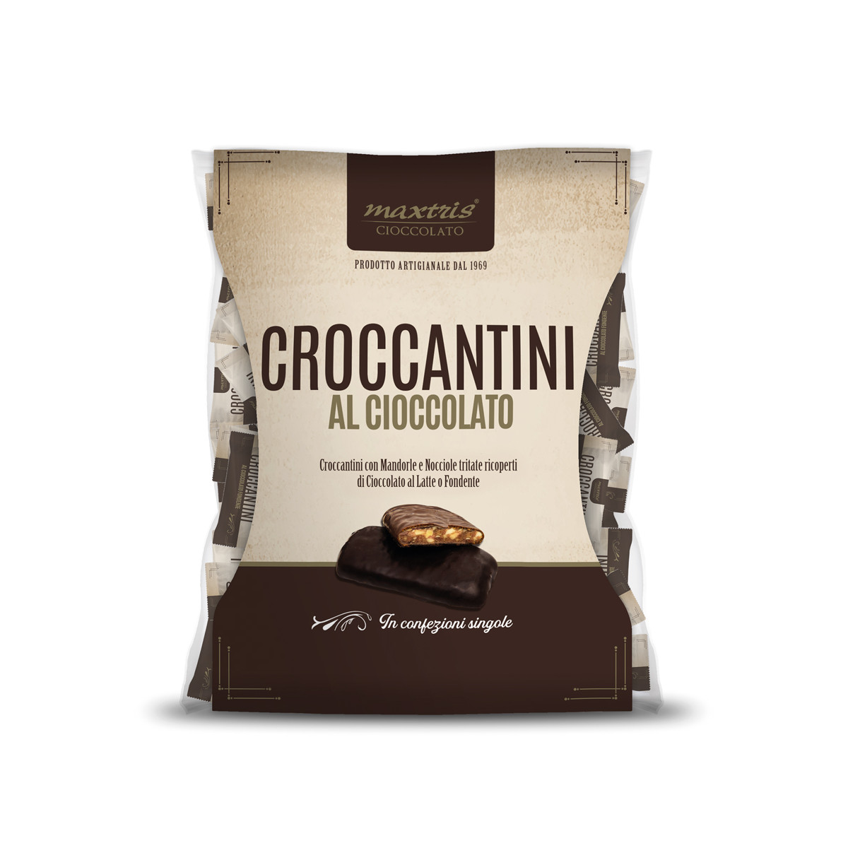 Croccantini con mandorle e nocciole tritate ricoperti di cioccolato al latte o fondente.