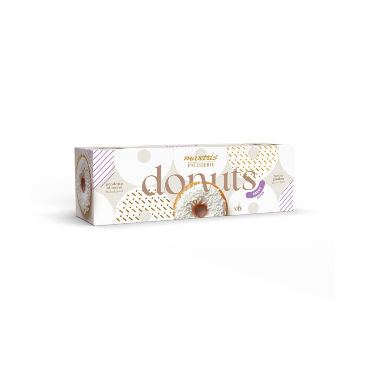 Donuts alla panna. Prodotto dolciario da forno ricoperto di glassa al gusto panna e codette di zucchero. Senza glutine.