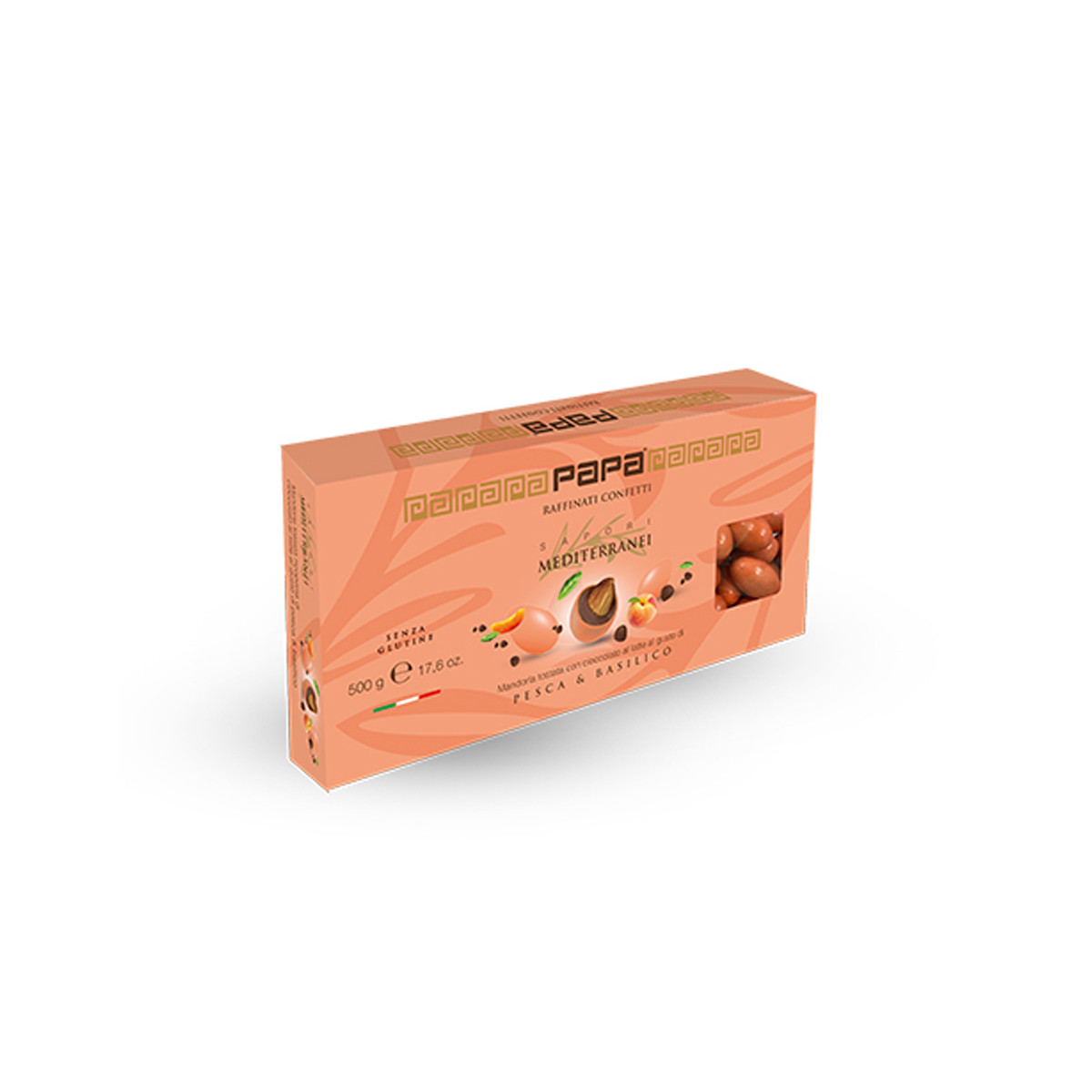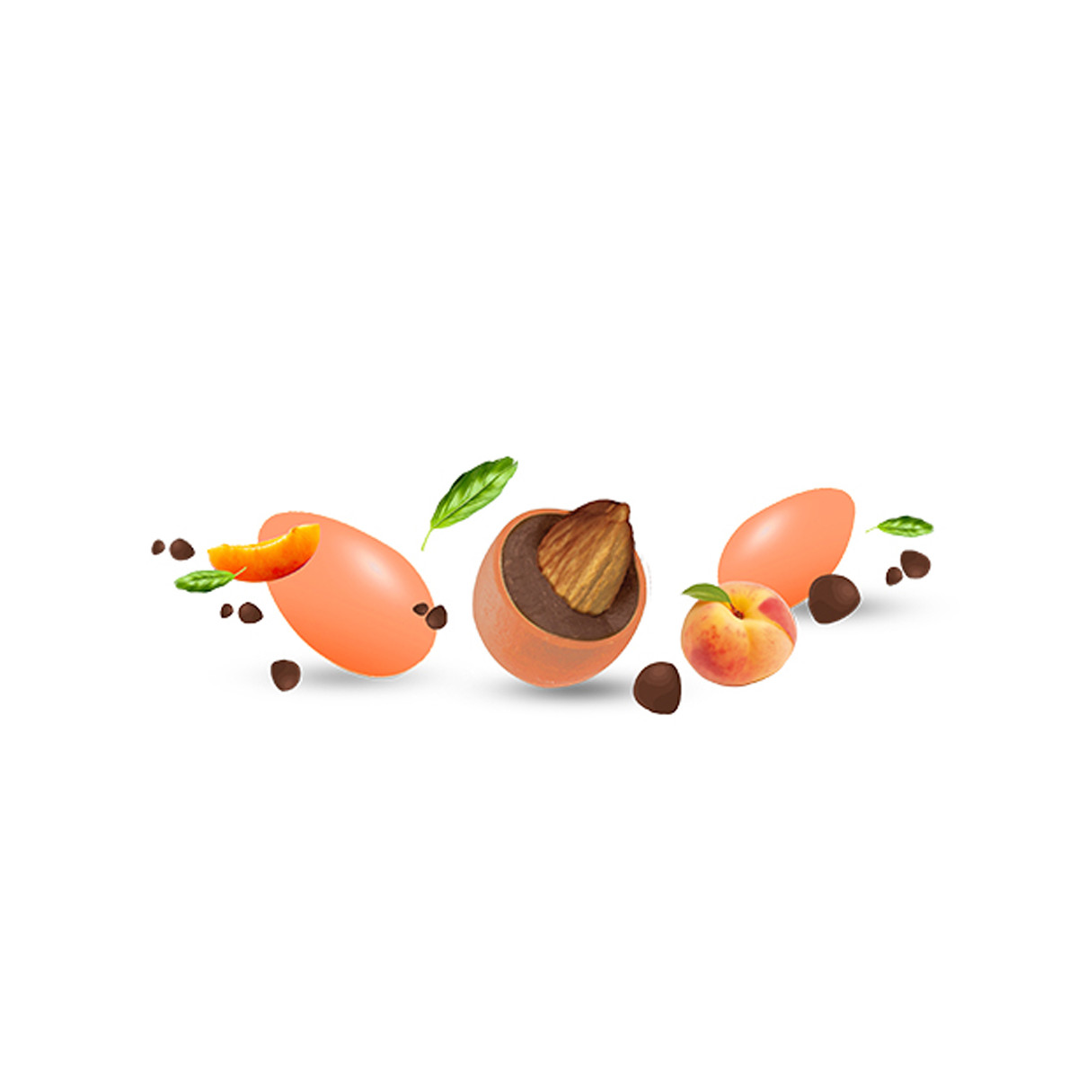 Dragee con mandorla tostata ricoperta di al cioccolato al latte con gusto di pesca e basilico. Sapori mediterranei. Senza glutine. Perfetto per confettate, sweet table e bomboniere eleganti.
