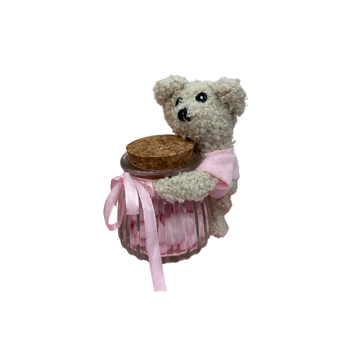 Piccolo orsetto con nastrini rosa, ideale come decorazione da richiudere intorno ad oggetti e sacchettini per dare un tocco in più alla tua bomboniera.