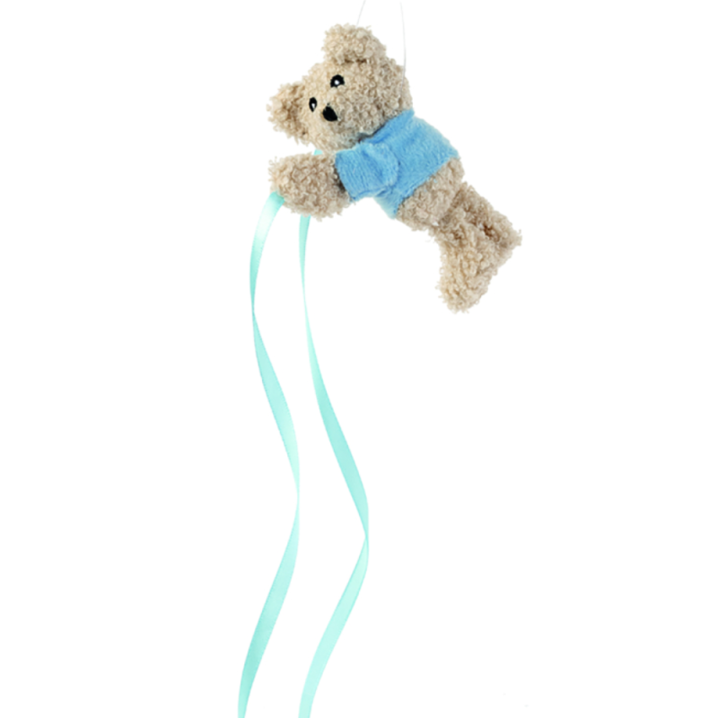 Piccolo orsetto con nastrini azzurri, ideale come decorazione da richiudere intorno ad oggetti e sacchettini per dare un tocco in più alla tua bomboniera.
