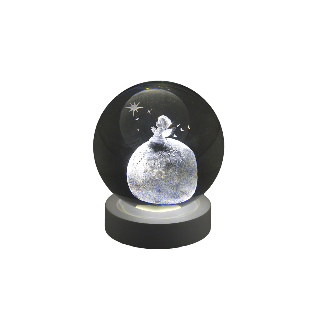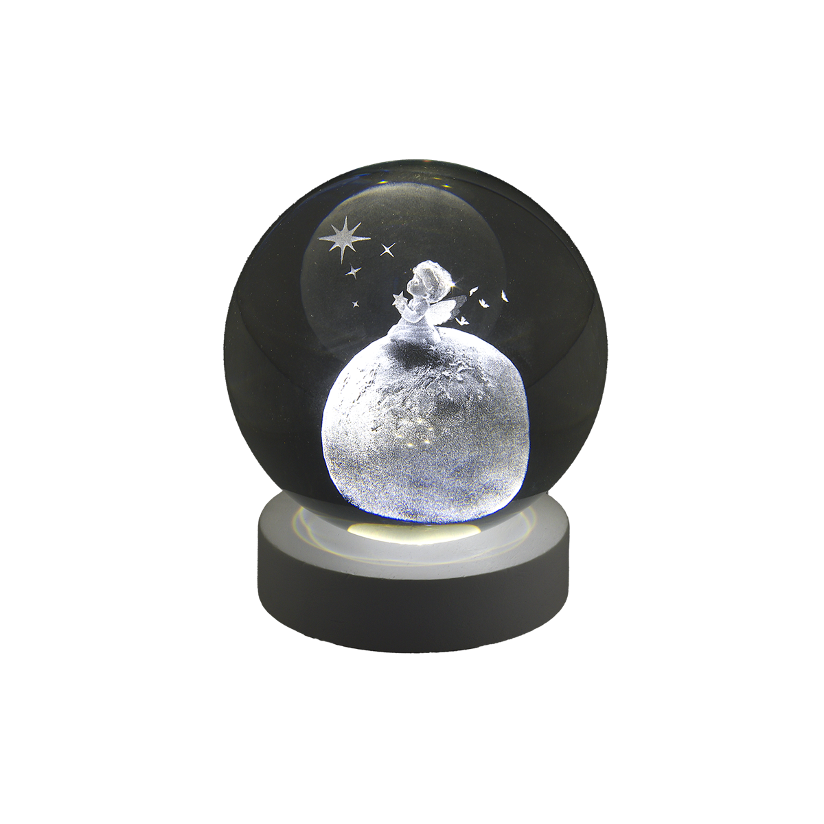 Sfera luminosa in vetro con grafica in 3D Angelo su Pianeta, con base scura. Ideale come bomboniera per ogni occasione.