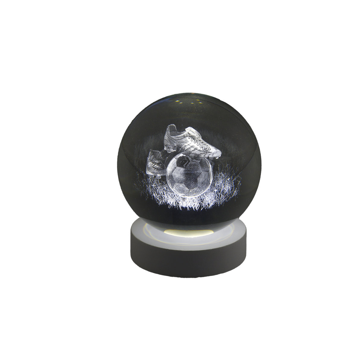 Sfera luminosa in vetro con grafica in 3D Calciatore con base scura. Ideale come bomboniera per ogni occasione.