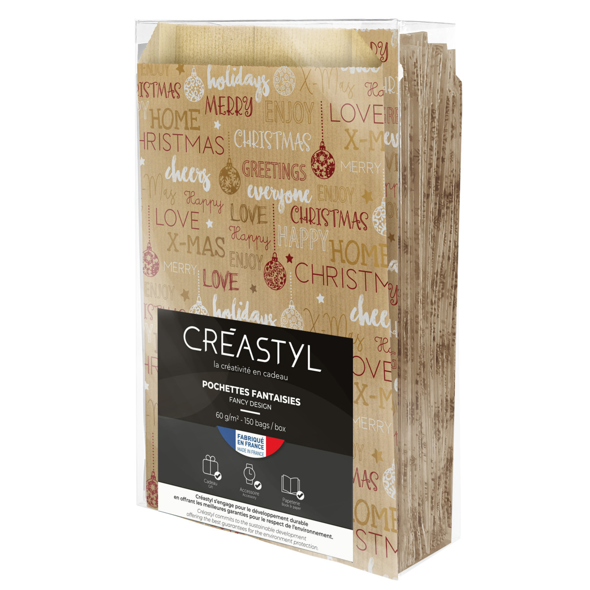 Buste in carta kraft decorate con scritte e sfere natalizie: perfette per confezionare regali e prodotti natalizi con eleganza e stile. Non idonee al contatto alimentare.