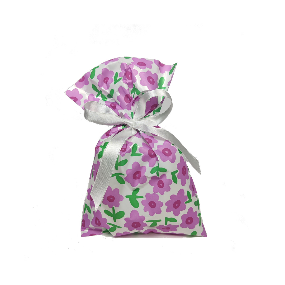 Buste regalo in polipropilene fantasia con stampa margherite lilla. Disponibile anche in giallo e rosso.