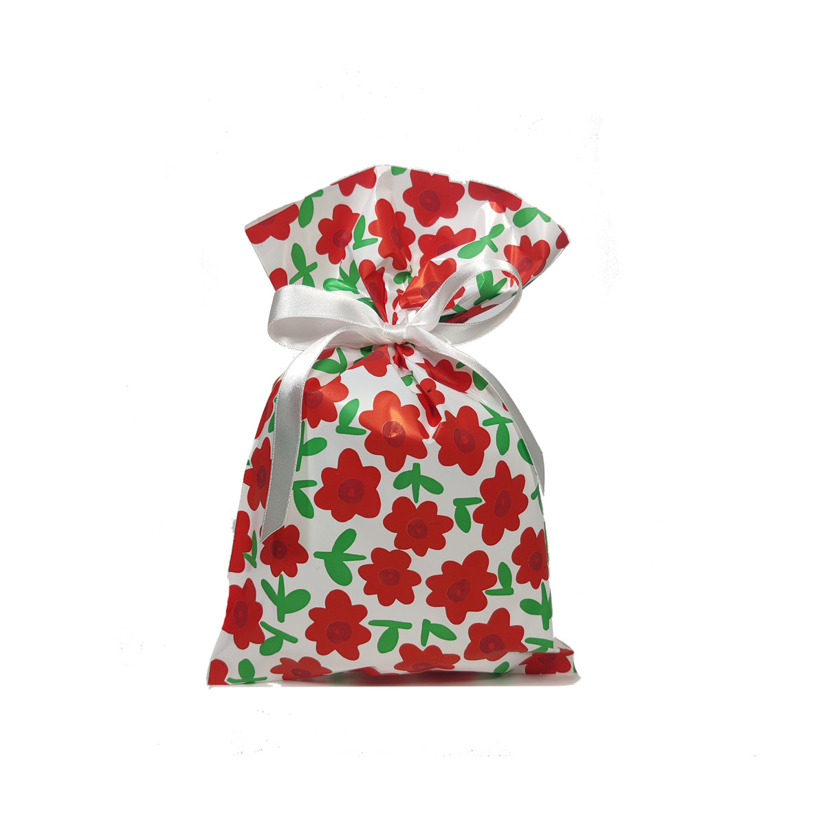Buste regalo in polipropilene fantasia con stampa margherite rosse. Disponibile anche in giallo e lilla.