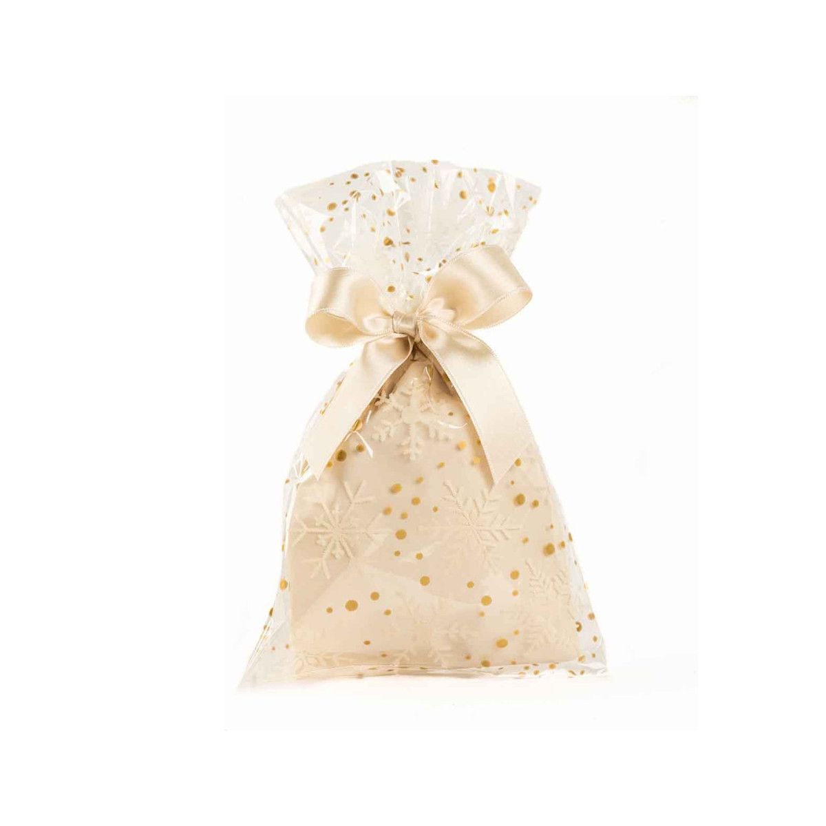 Buste da regalo natalizie in polipropilene con stampa fiocchi di neve e pallini oro. Materiale IDONEO al contatto alimentare.