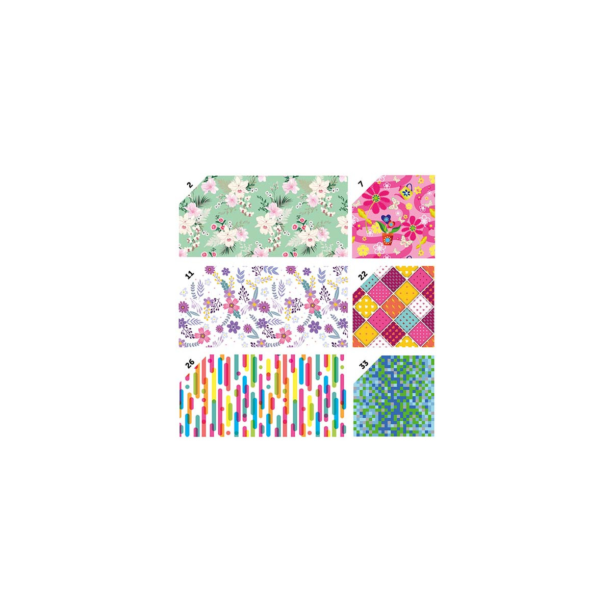 Bobina in carta regalo Fancy Primaverile, con fantasie floreali e geometriche assortite, perfetta per confezioni eleganti e stagionali. Misura: 70cmx2mt