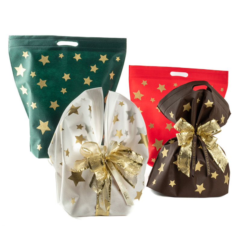 Shopper in tessuto non tessuto. Ideale come portapanettone con fantasia stelle. In confezione da 12 pezzi, assortiti in 4 colori.