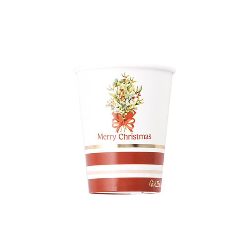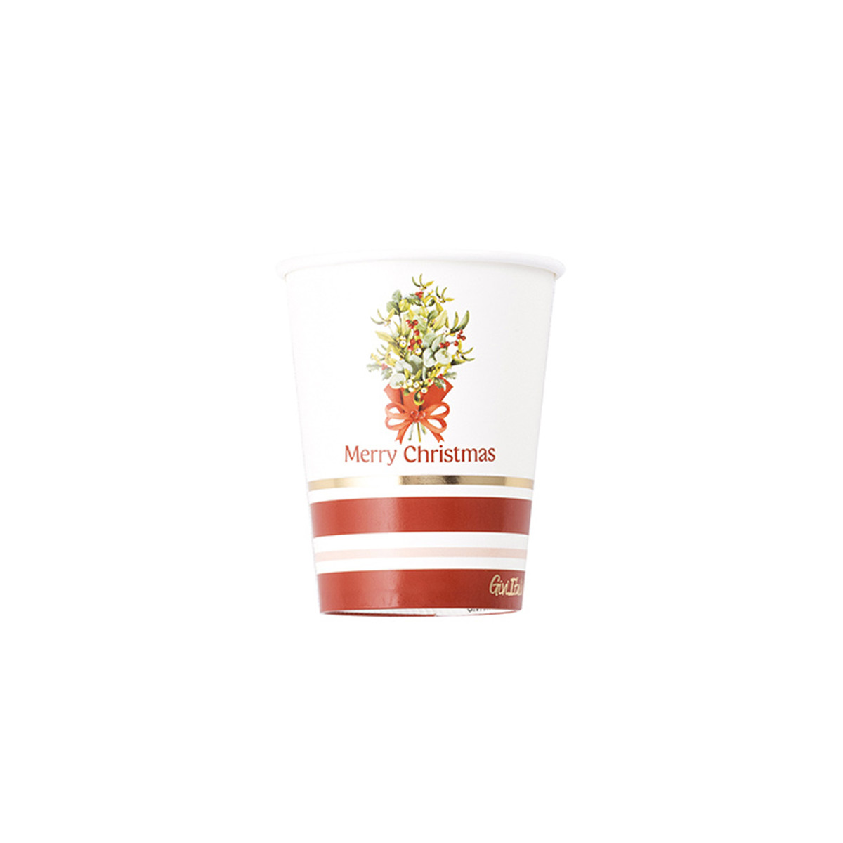 Bicchieri in carta Christmas Party, con stampa scritta Merry Christmas e mazzolino di fiorellini natalizi. Da abbinare ai piatti e tovaglioli della stessa linea.