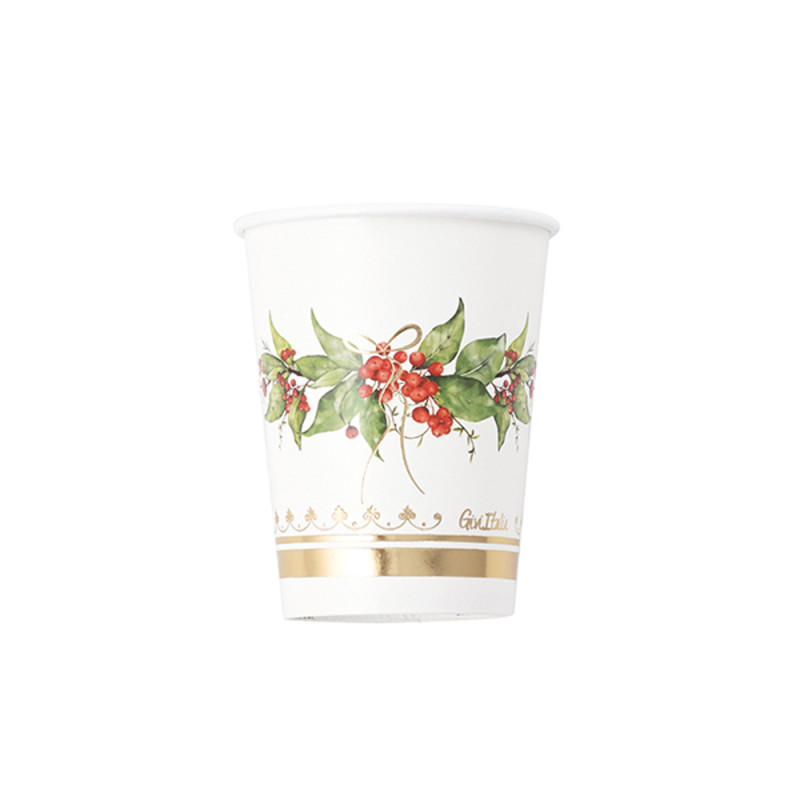 Bicchieri in carta con scritta Merry Christmas e decoro con agrifoglio e bacche rosse. Da abbinare ai piatti e tovaglioli della stessa linea.