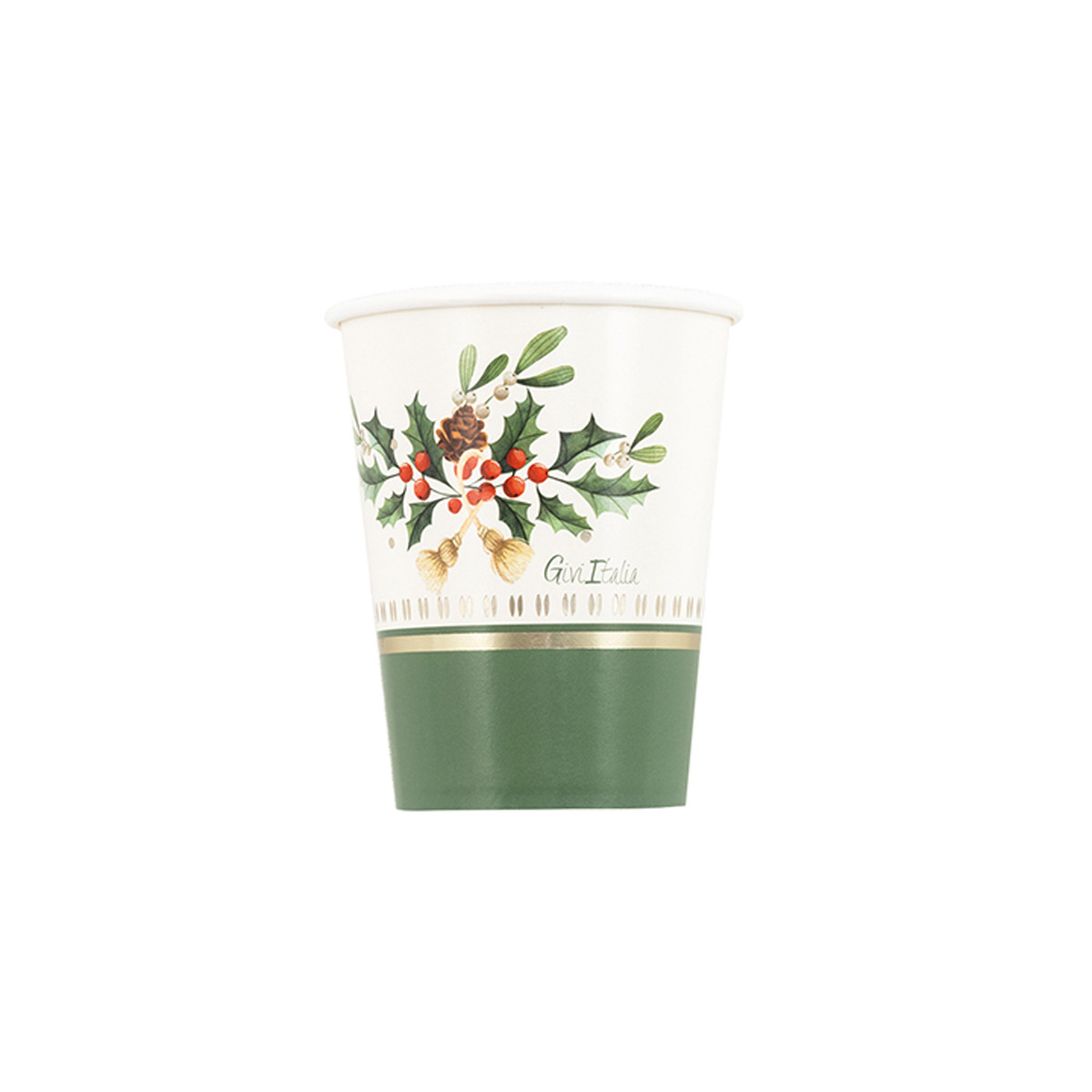 Bicchieri in carta con stampa pick bacche e foglie. Disponibili i piatti e i tovaglioli della stessa linea.