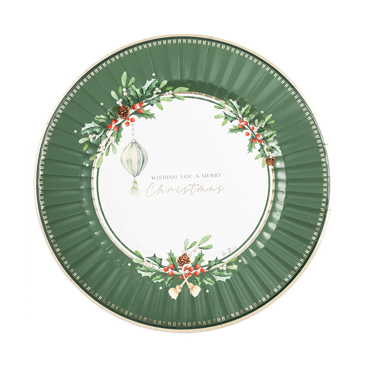 Maxi piatti in carta con bordo verde e pick con bacche e foglioline. Disponibili, sul nostro sito, i piatti in formati più piccoli, tovaglioli e bicchieri della stessa linea.
