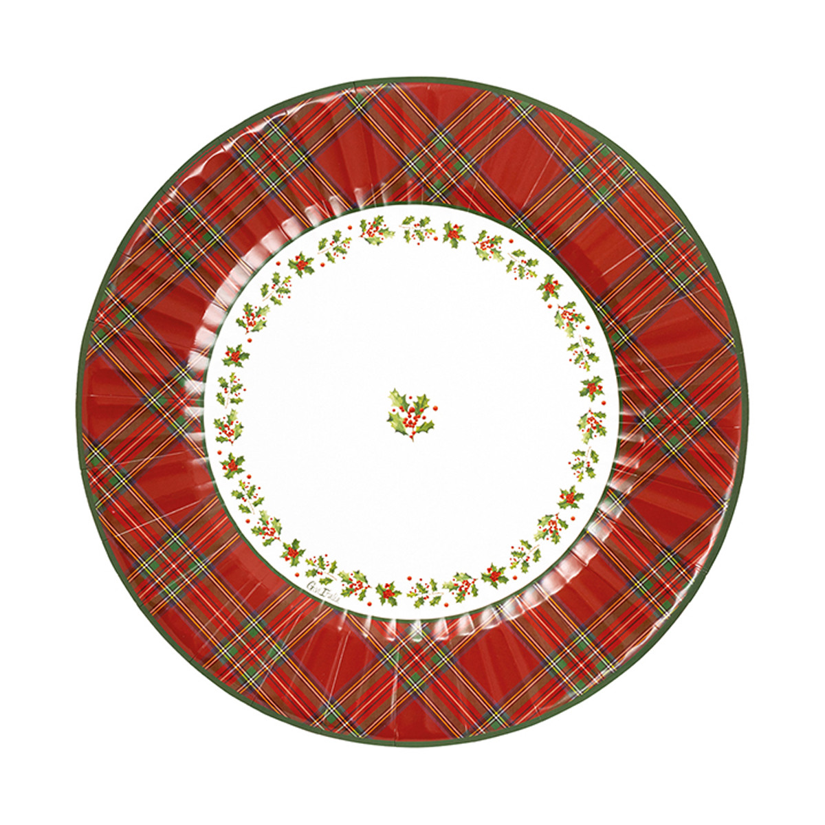 Maxi piatti in carta tondi con fantasia scozzese e pick agrifoglio e bacche rosse. Disponibile, sul nostro sito, anche i bicchieri e tovaglioli della stessa Linea.
