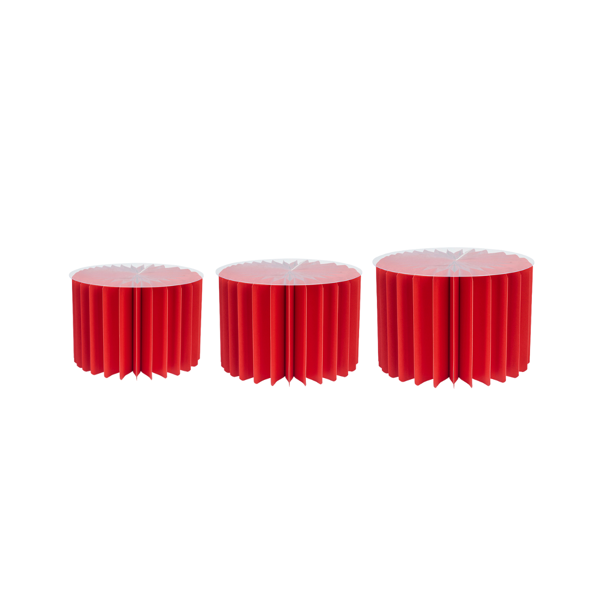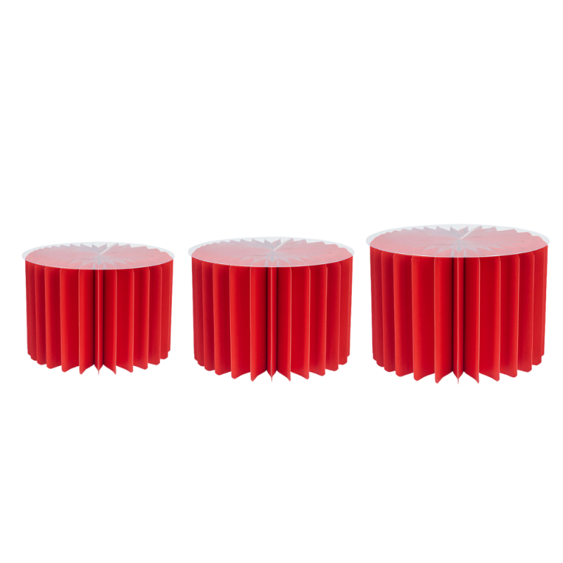Alzata plissettata in carta rossa con piano di appoggio trasparente. Ottima come espositore per negozi e vetrine.