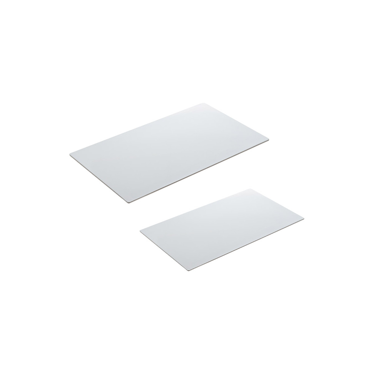 Vassoio bianco senza bordi rettangolare in melamina dal design elegante e sobrio. Disponibile in due formati.