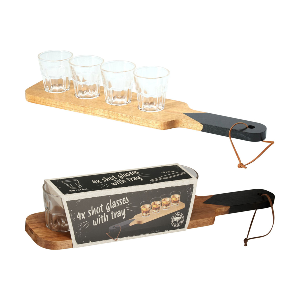 VASSOIO IN LEGNO CON BICCHIERINI IN VETRO (4 PEZZI)