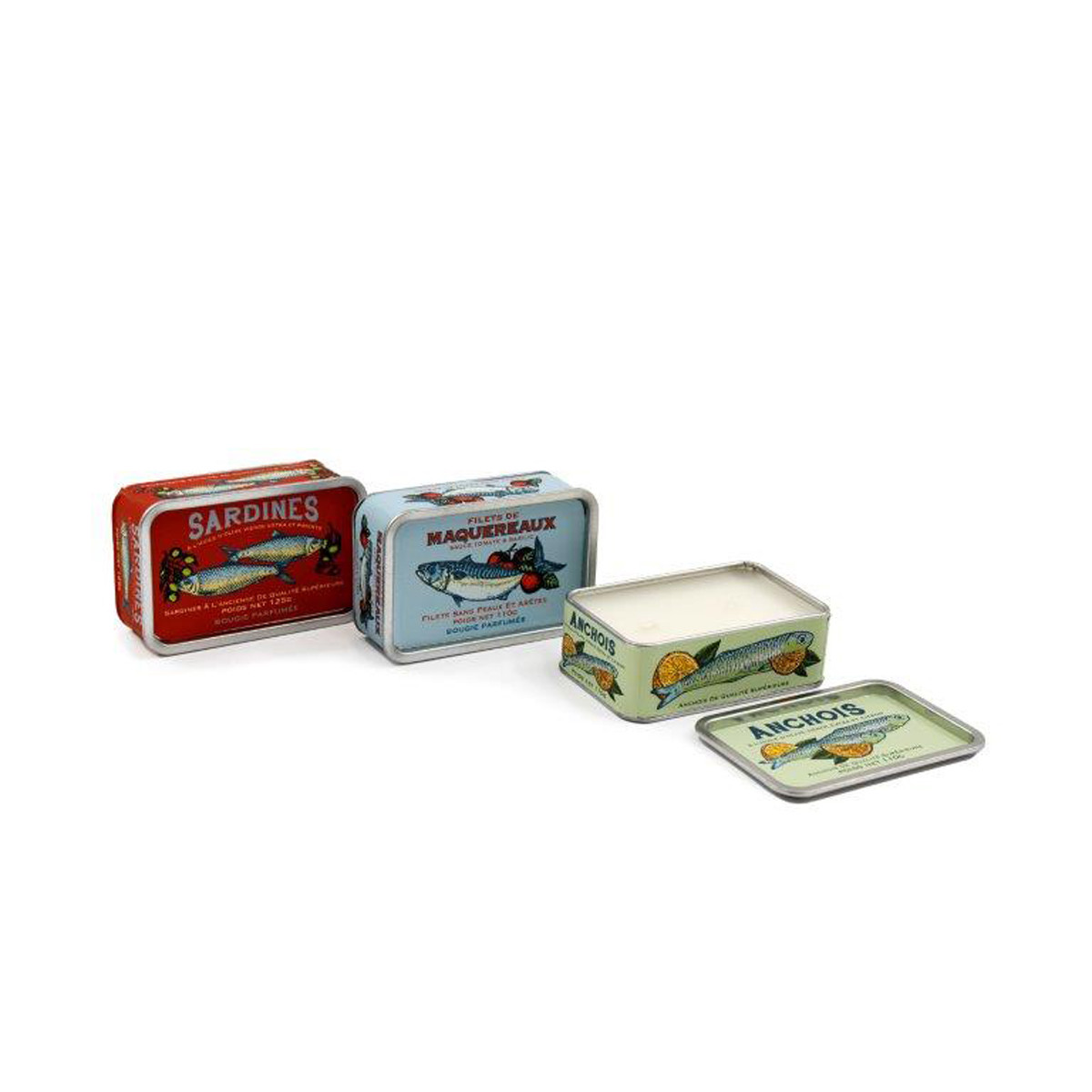 Candela rettangolare in latta a forma di scatoletta di sardine.