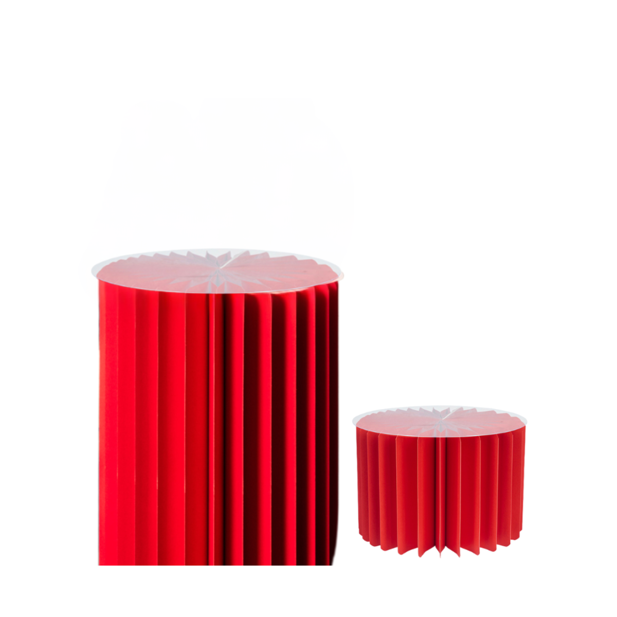 Alzata plissettata in carta rossa con piano di appoggio trasparente. Ottima come espositore per negozi e vetrine.
