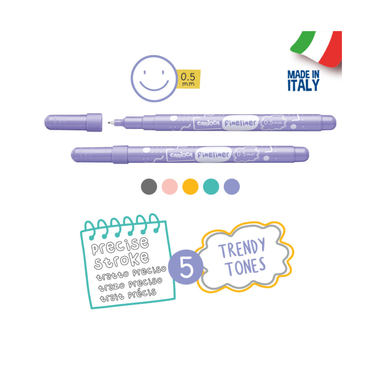 I fineliner Music Carioca (5 pezzi) sono ideali per studenti, professionisti, artisti e bambini che desiderano scrivere, disegnare o colorare con precisione. Perfetti per scuole, laboratori creativi, studi di design e attività didattiche, garantiscono comfort di utilizzo e una resa colore intensa e uniforme.