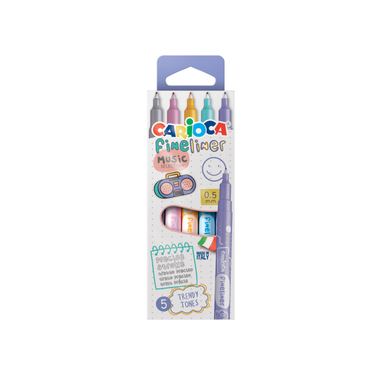 Set pratico di 5 fineliner Music Carioca, perfetti per scrittura, disegno e lavori creativi di precisione. Scatola con 5 pennarelli in colori assortiti. Colori brillanti.