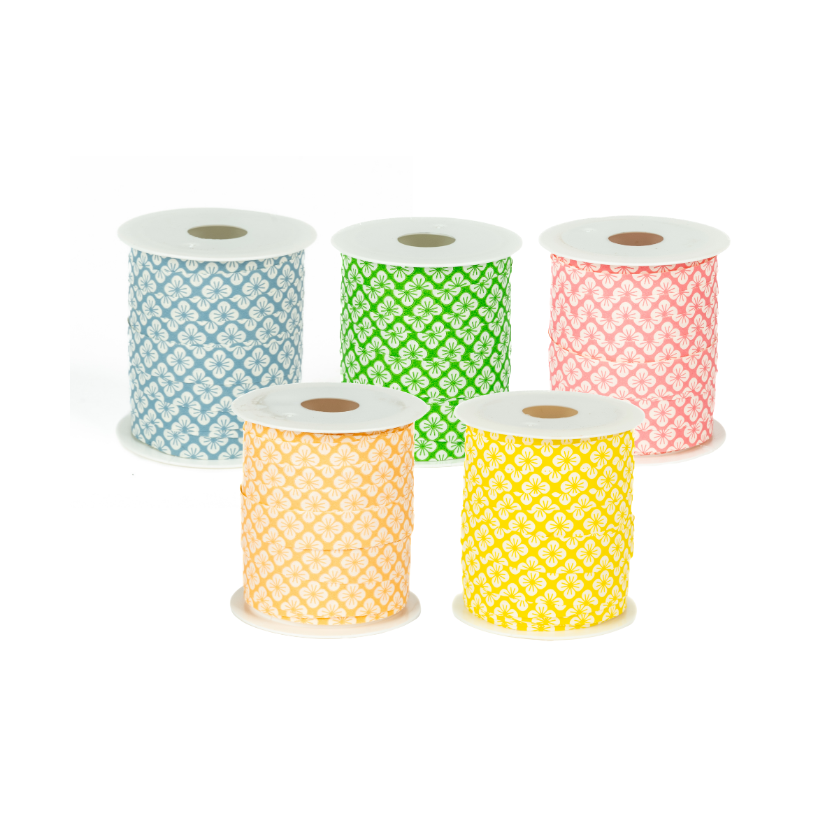 Nastro in polipropiline con stampa floreale. Vendita in bobina da 10 metri, colori assortiti.