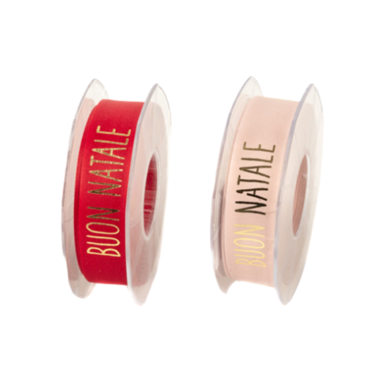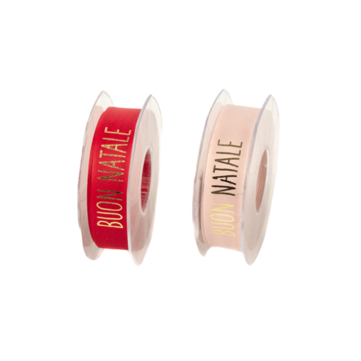 - Tessuto con stampa scritta Buon Natale in maiuscolo color oro su tutta la lunghezza del nastro