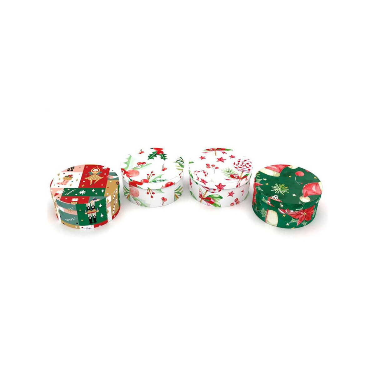 Elegante scatola tonda verde e bianca con fantasia natalizia assortita, ideale come contenitore per dolci, biscotti o piccoli regali durante le festività.