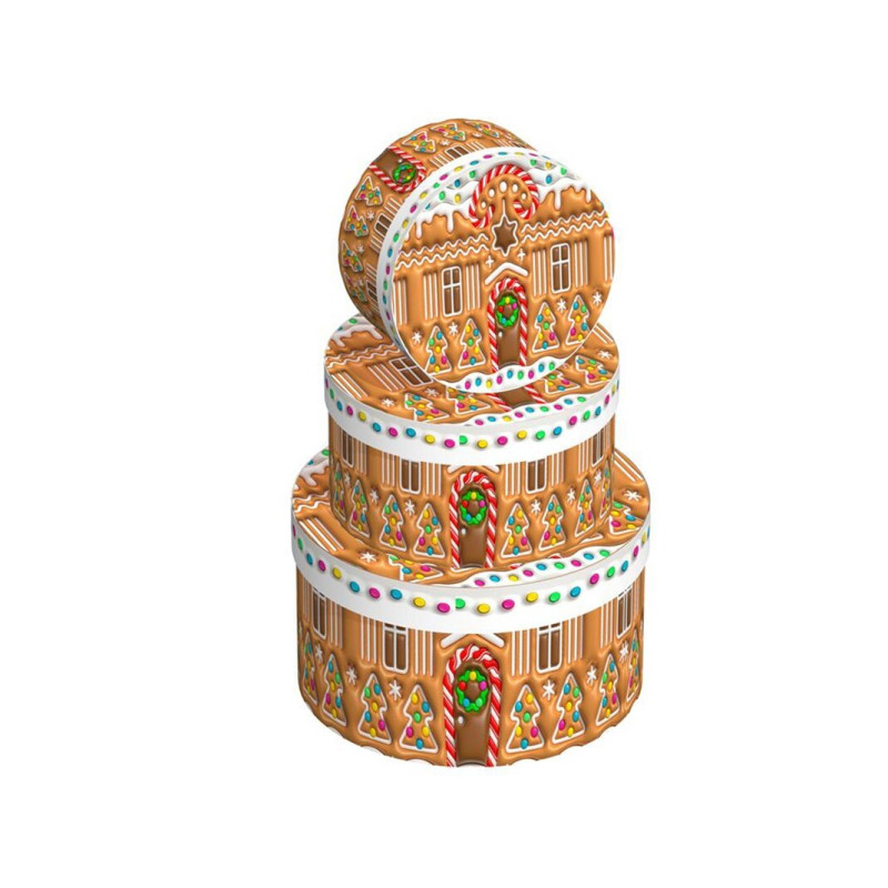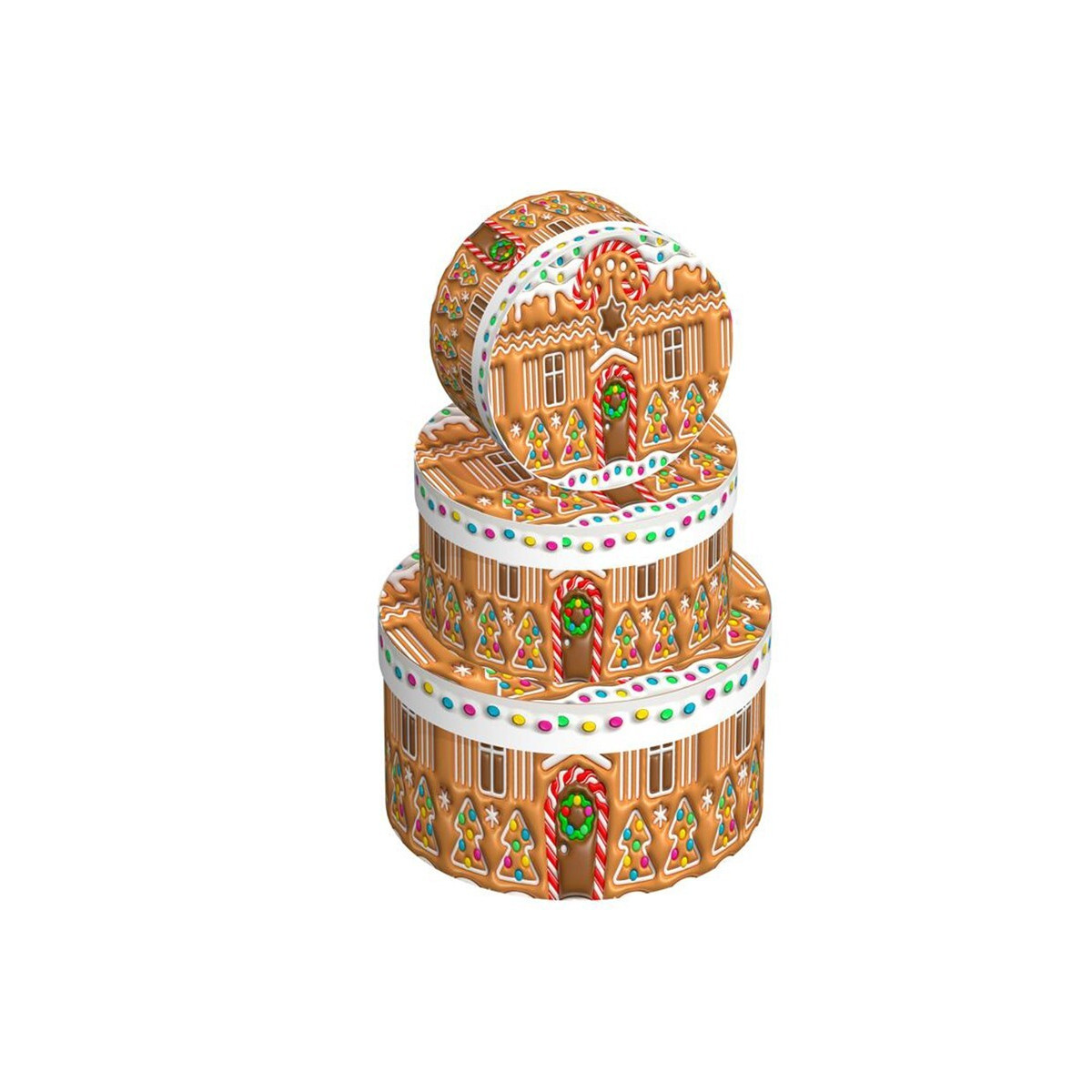 Elegante scatola tonda natalizia decorata con la fantasia Casetta di Marzapane, perfetta come contenitore per dolciumi o piccoli regali durante le festività.