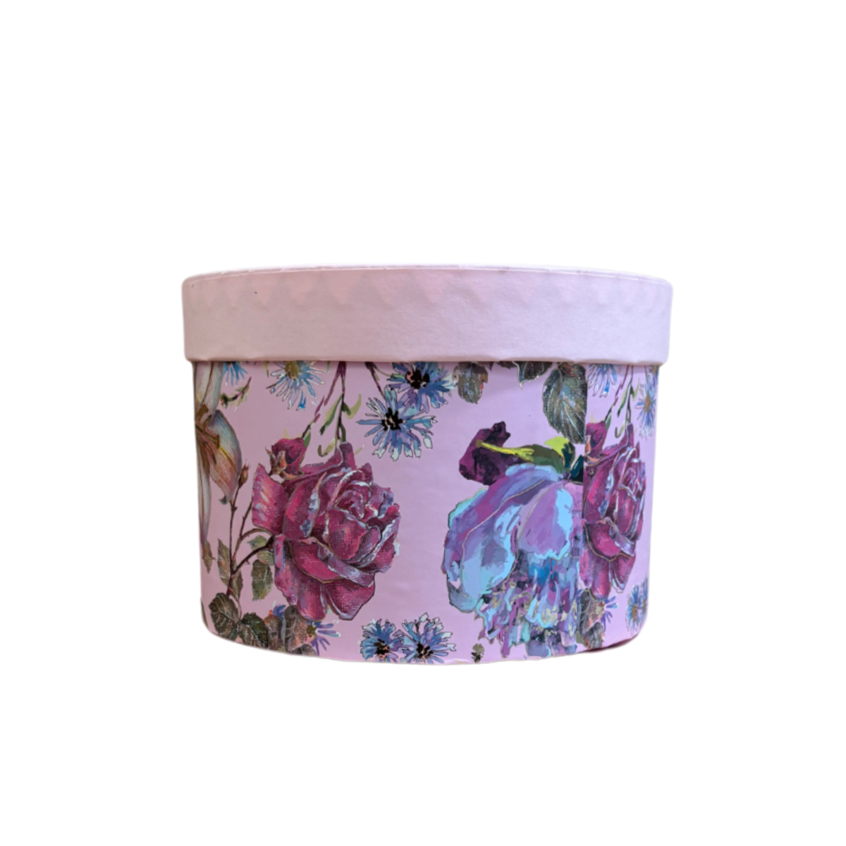 Scatola tonda con fantasia floreale e sfondo rosa, con coperchio coordinato. Ideale per confezioni regalo, allestimento vetrine e composizioni eleganti.