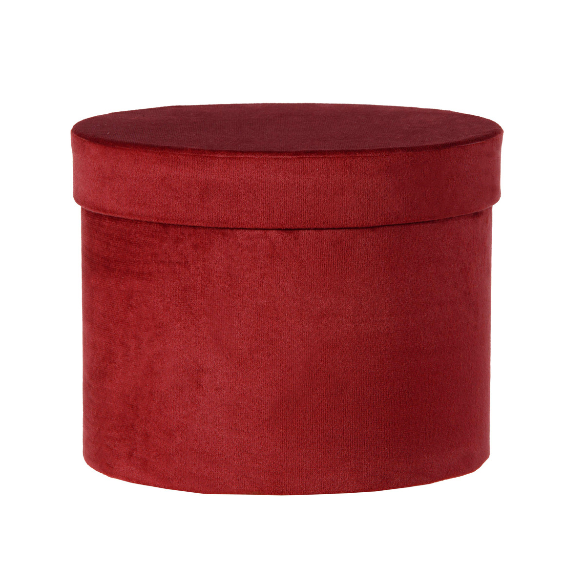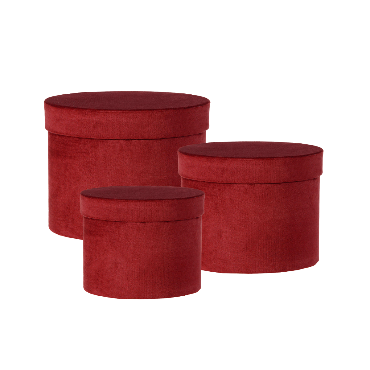 Elegante scatola tonda in velluto rosso, ideale come contenitore per regali, gioielli o oggetti di valore. Raffinata, resistente e pronta per un packaging di classe.