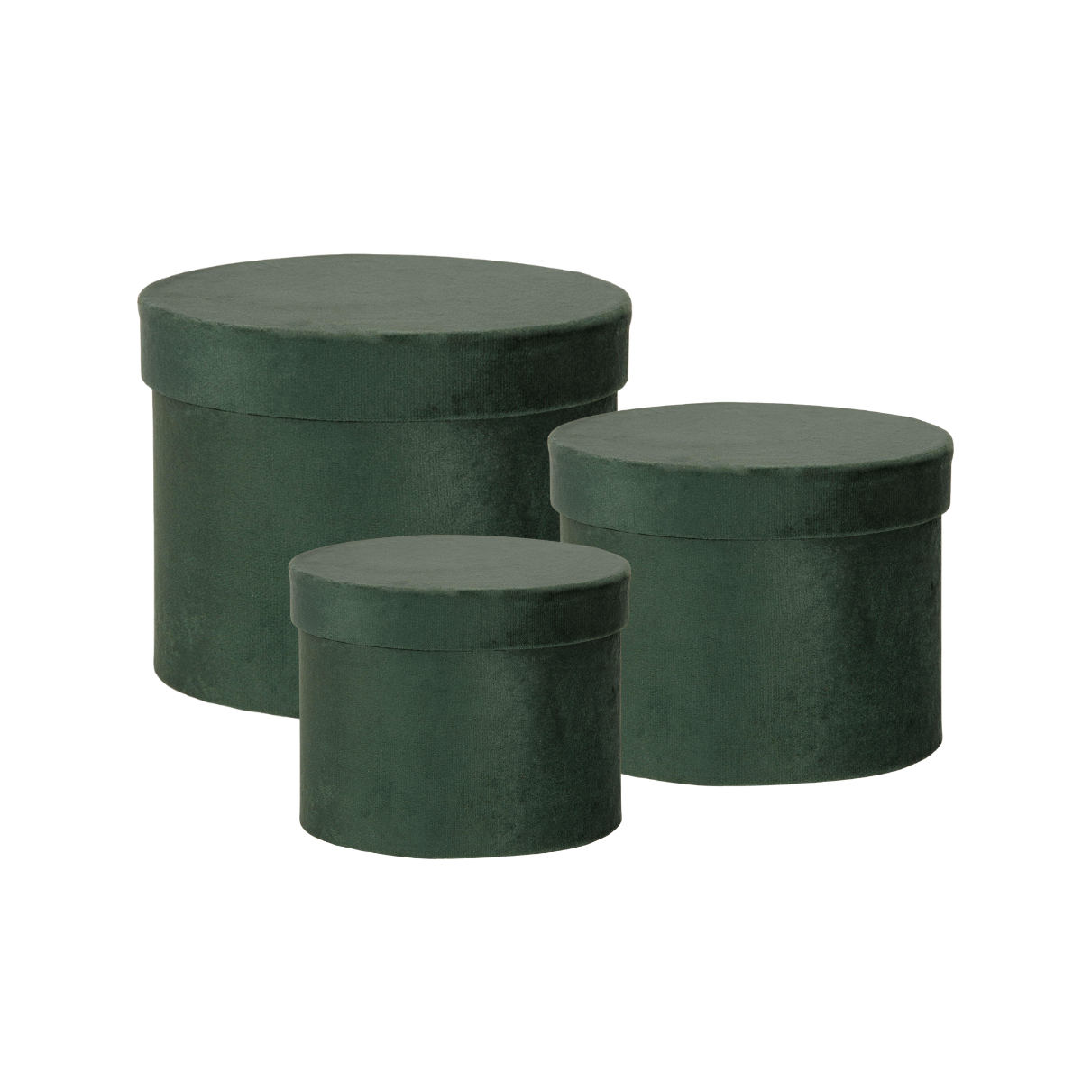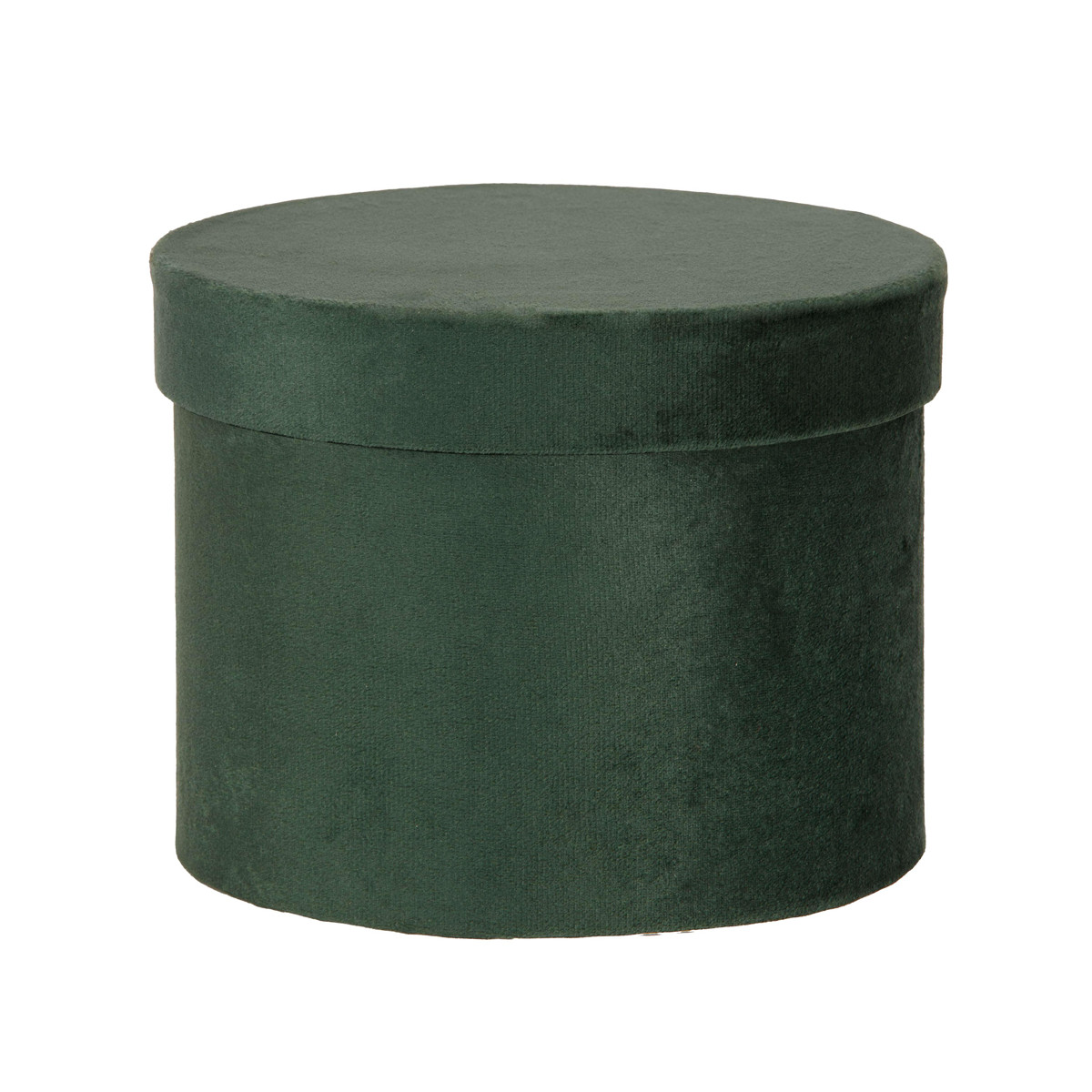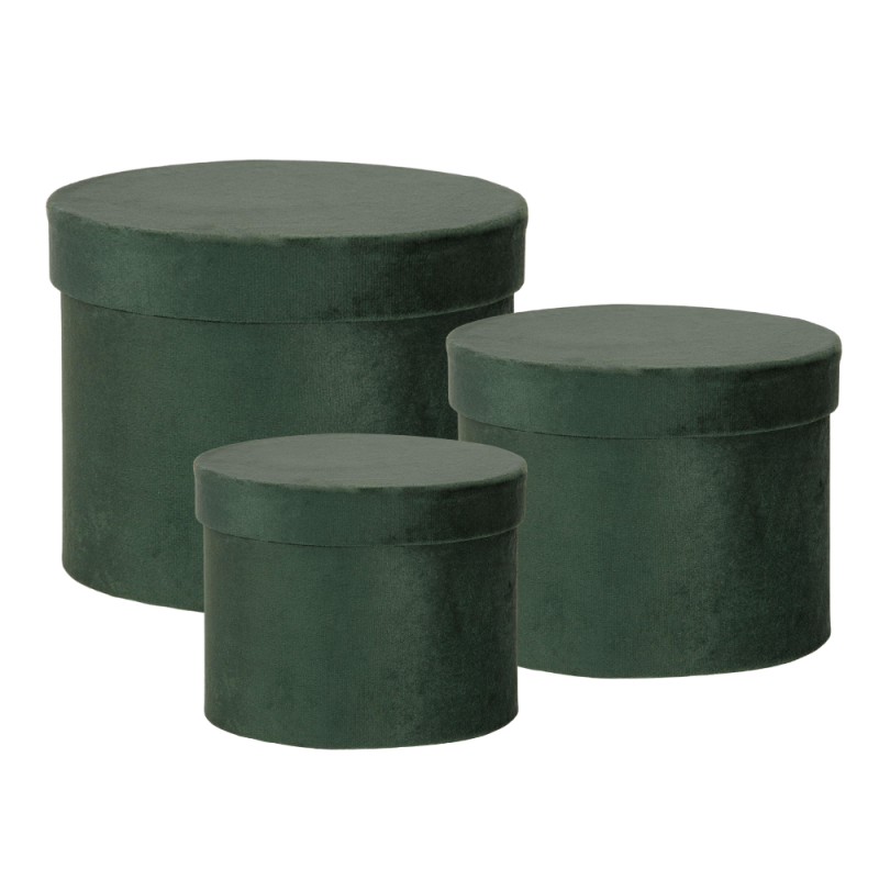 Elegante scatola tonda in velluto verde, ideale come contenitore per regali, gioielli o oggetti di valore. Raffinata, resistente e pronta per un packaging di classe.