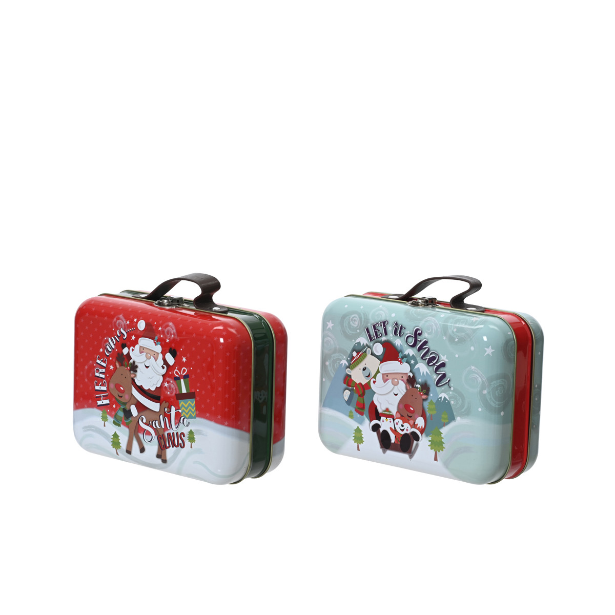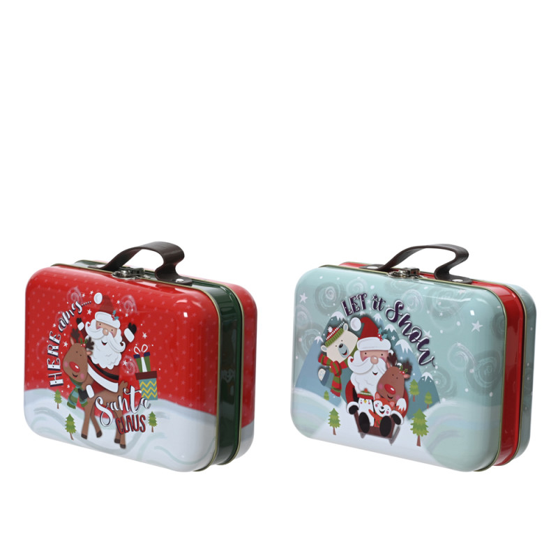 Scatola in latta a forma di valigetta con fantasia natalizia in colori assortiti. Realizzata per contenere oggettistica varia, come regalo di Natale e per decorare il tuo locale, oppure come confezionamento originale per i tuoi regali.