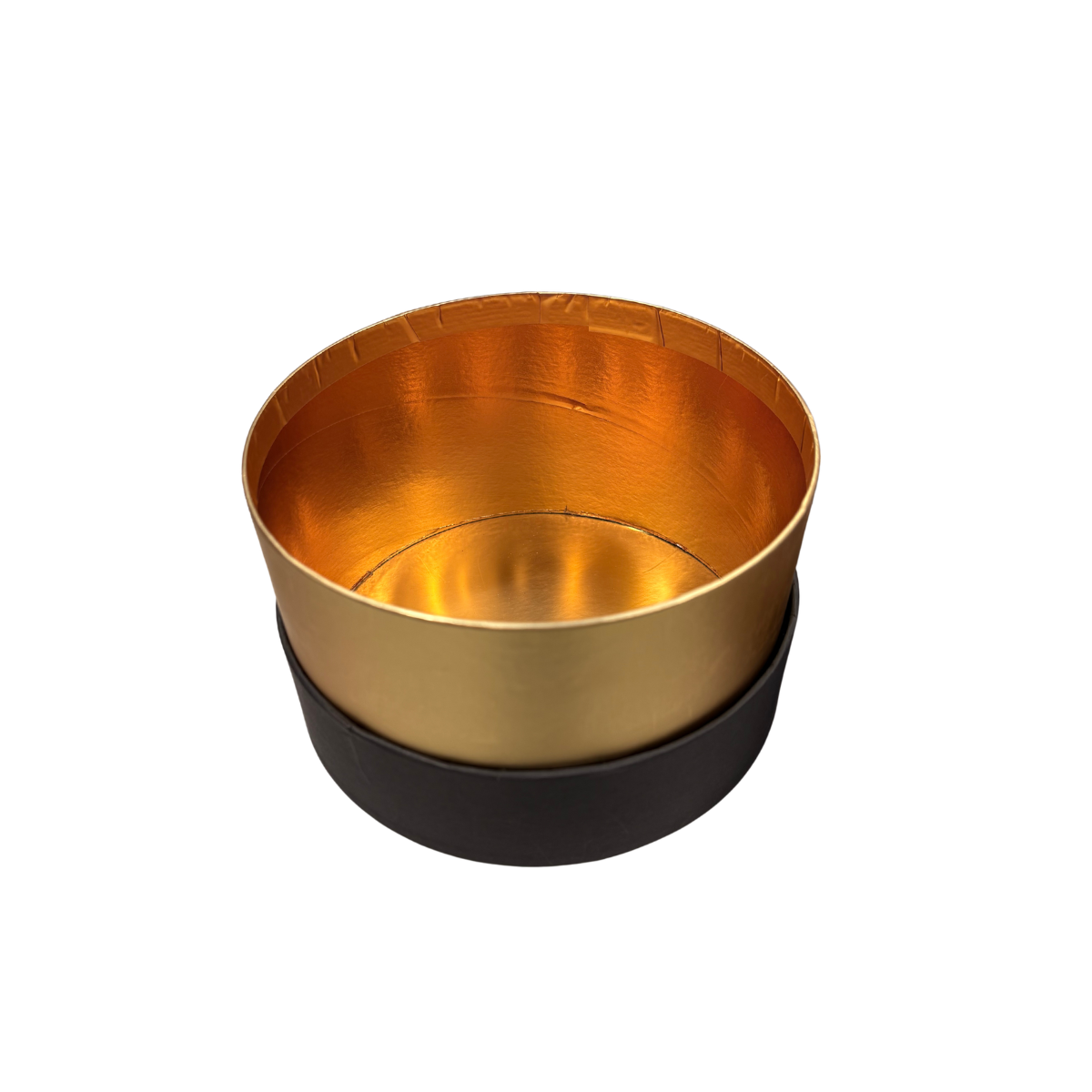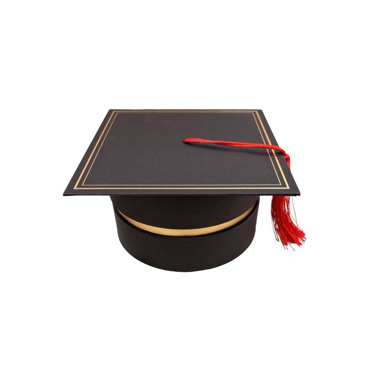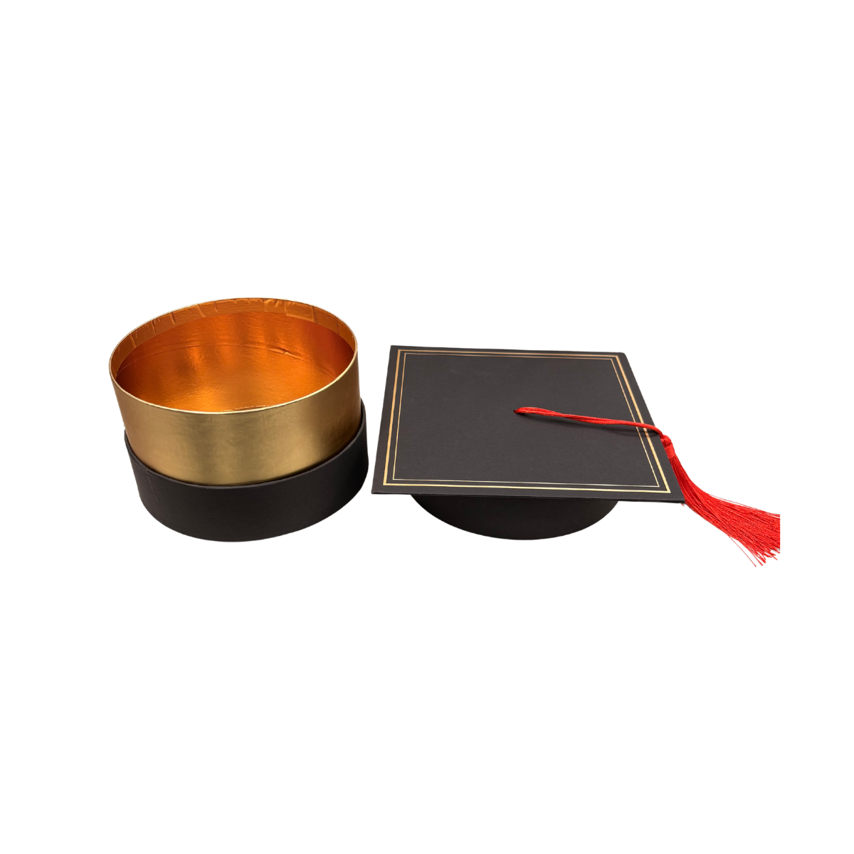 Elegante Scatola Tocco Laurea tonda nei colori nero e oro con nappa rossa, perfetta per confezionare bomboniere laurea, piccoli regali e confetti in occasione di feste di laurea.