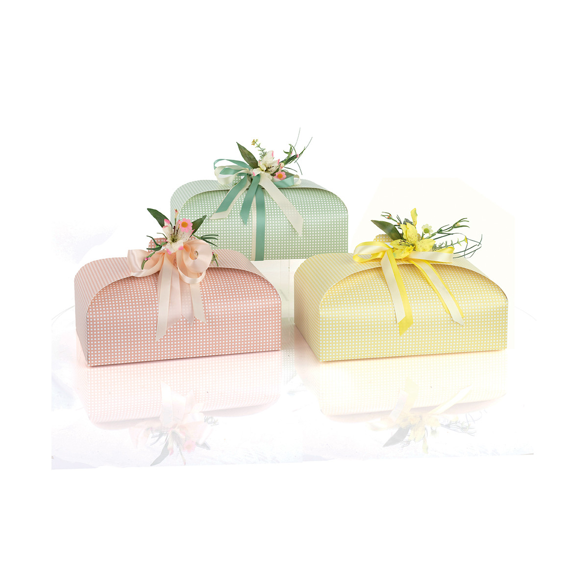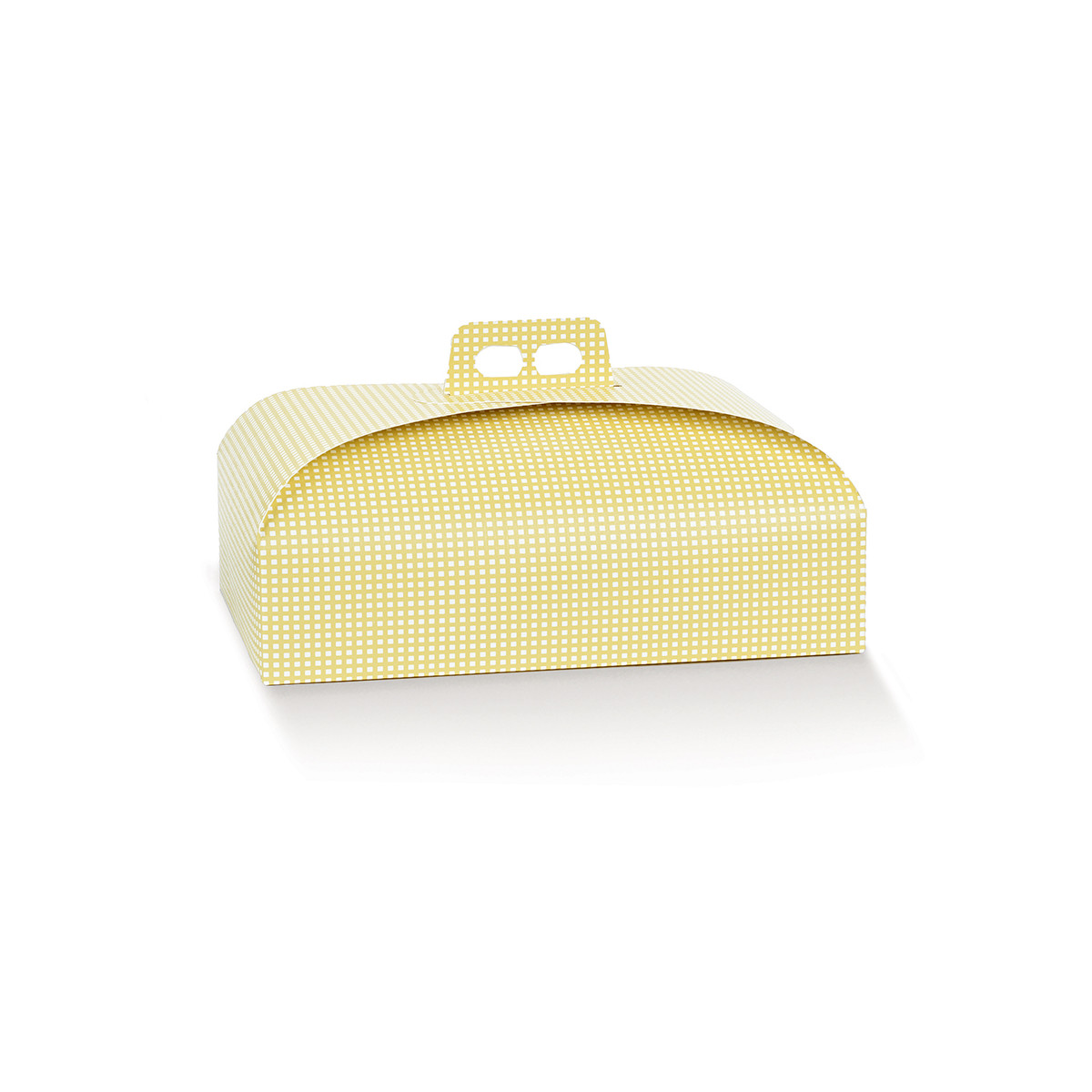 Scatola porta colomba 1kg con fantasia a quadri gialla, pensata per confezioni pasquali curate e di grande impatto visivo. In cartoncino rigido.