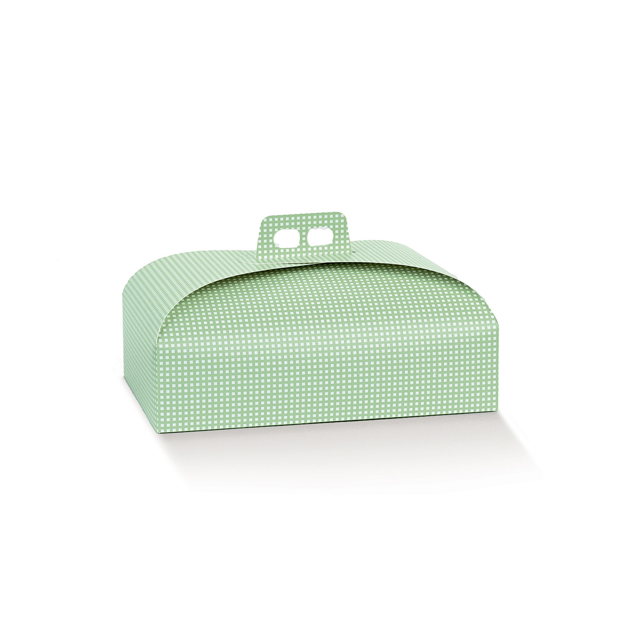 Scatola porta colomba 1kg con fantasia a quadri verde, pensata per confezioni pasquali curate e di grande impatto visivo. In cartoncino rigido.