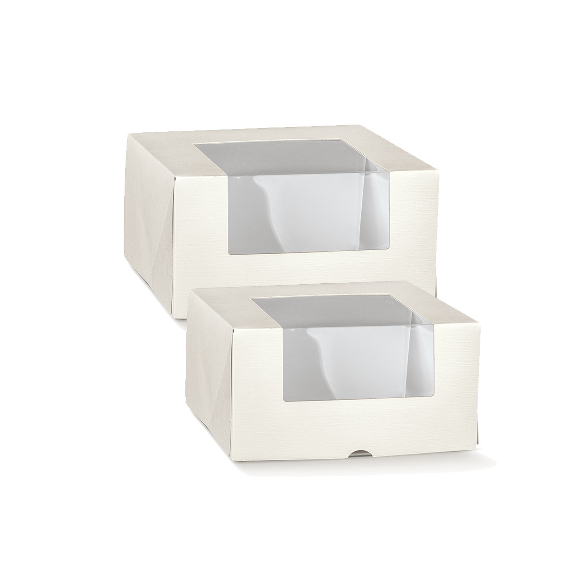 Scatole porta paste modello Pronta, con comoda chiusura frontale e finestra trasparente. In cartoncino rinforzato effetto fibra bianco, idoneo al contatto con gli alimenti. Soluzione ideale per confezionare torte e creazioni di pasticceria. Le misure sono da intendersi base x profondità x altezza e si riferiscono all'esterno della scatola.