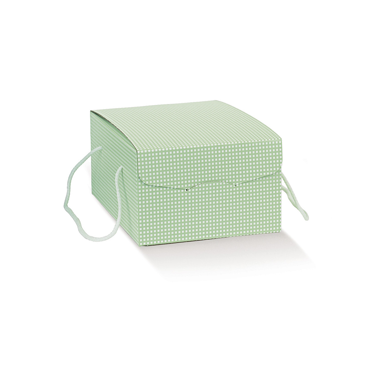 Scatola segreto con cordini quadri verdi, caratterizzata da fantasia geometrica primaverile e chiusura elegante a incastro, perfetta per confezioni regalo di fascia medio-alta. In cartoncino rigido, ideale per il trasporto di colombe artigianali.
