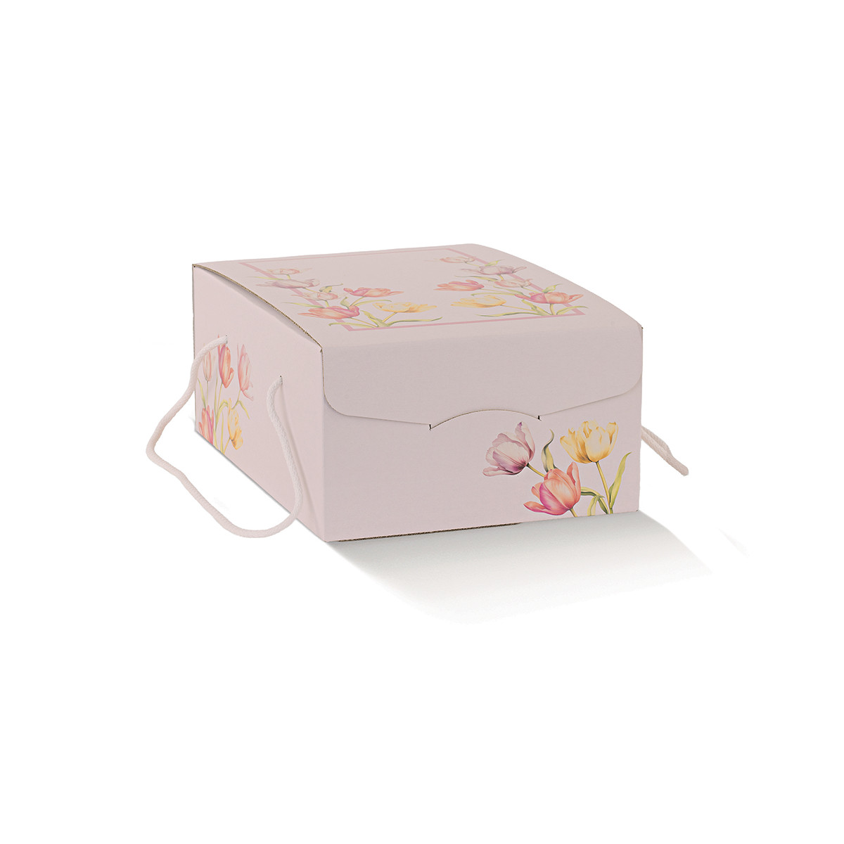Scatola segreto con cordini Tulips, caratterizzata da fantasia floreale primaverile e chiusura elegante a incastro, perfetta per confezioni regalo di fascia medio-alta. In cartoncino rigido, ideale per il trasporto di colombe artigianali.