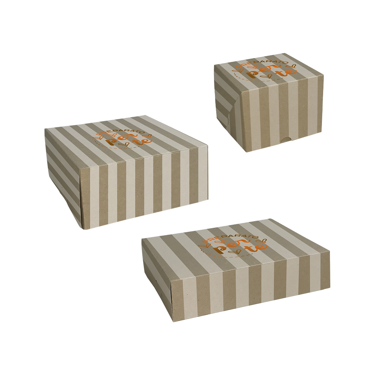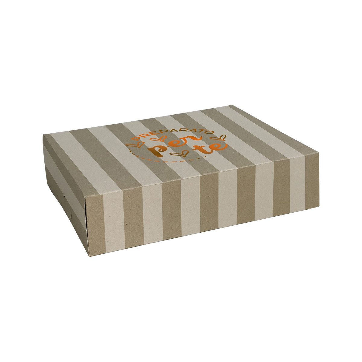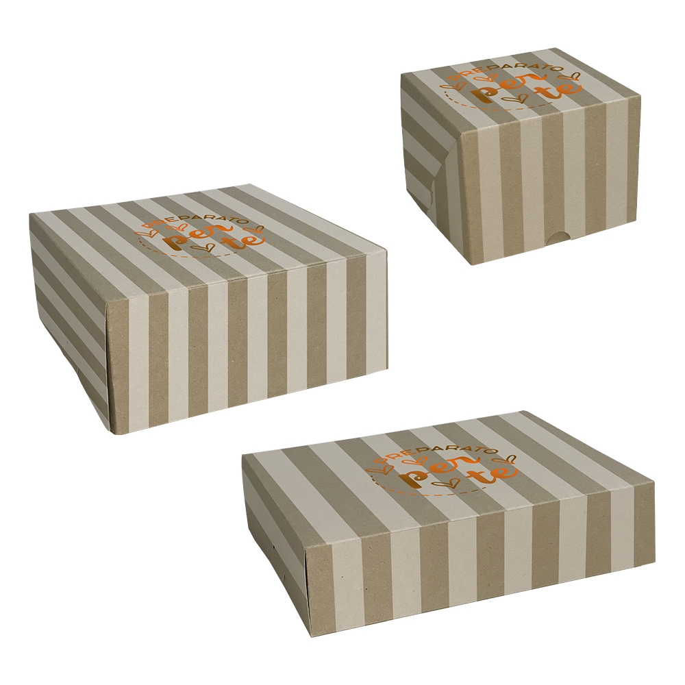Scatole della linea esclusiva Incartare "Preparato per Te". Fantasia righe verticali marroni e beige. Disponibili in diversi formati e dimensioni: monoporzione dama, scrigno e dama tradizionale.