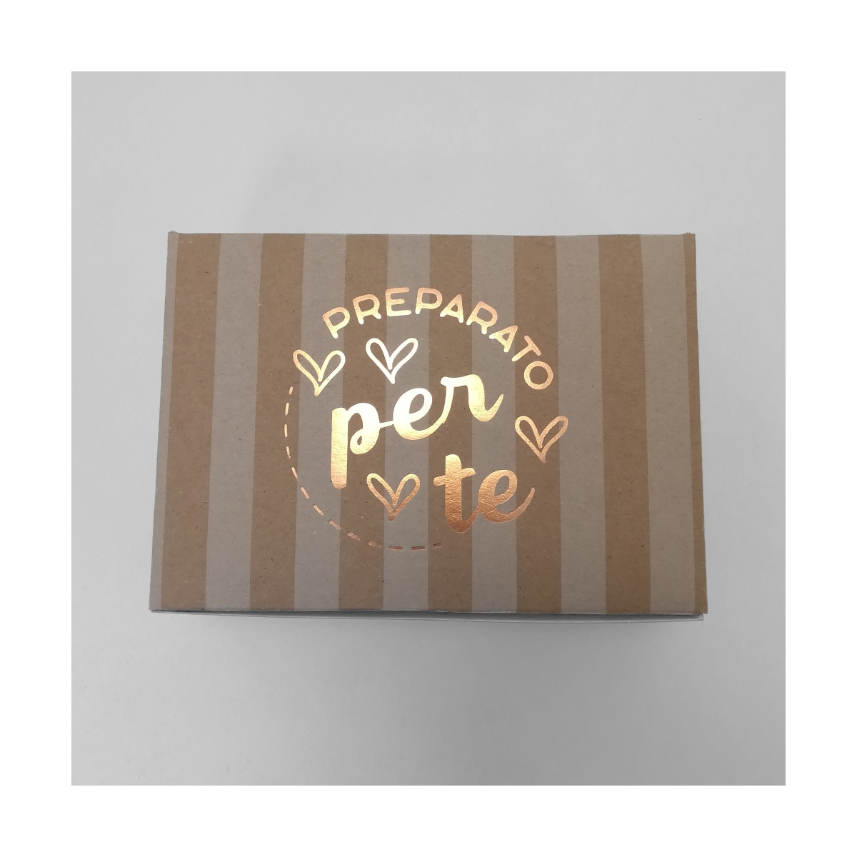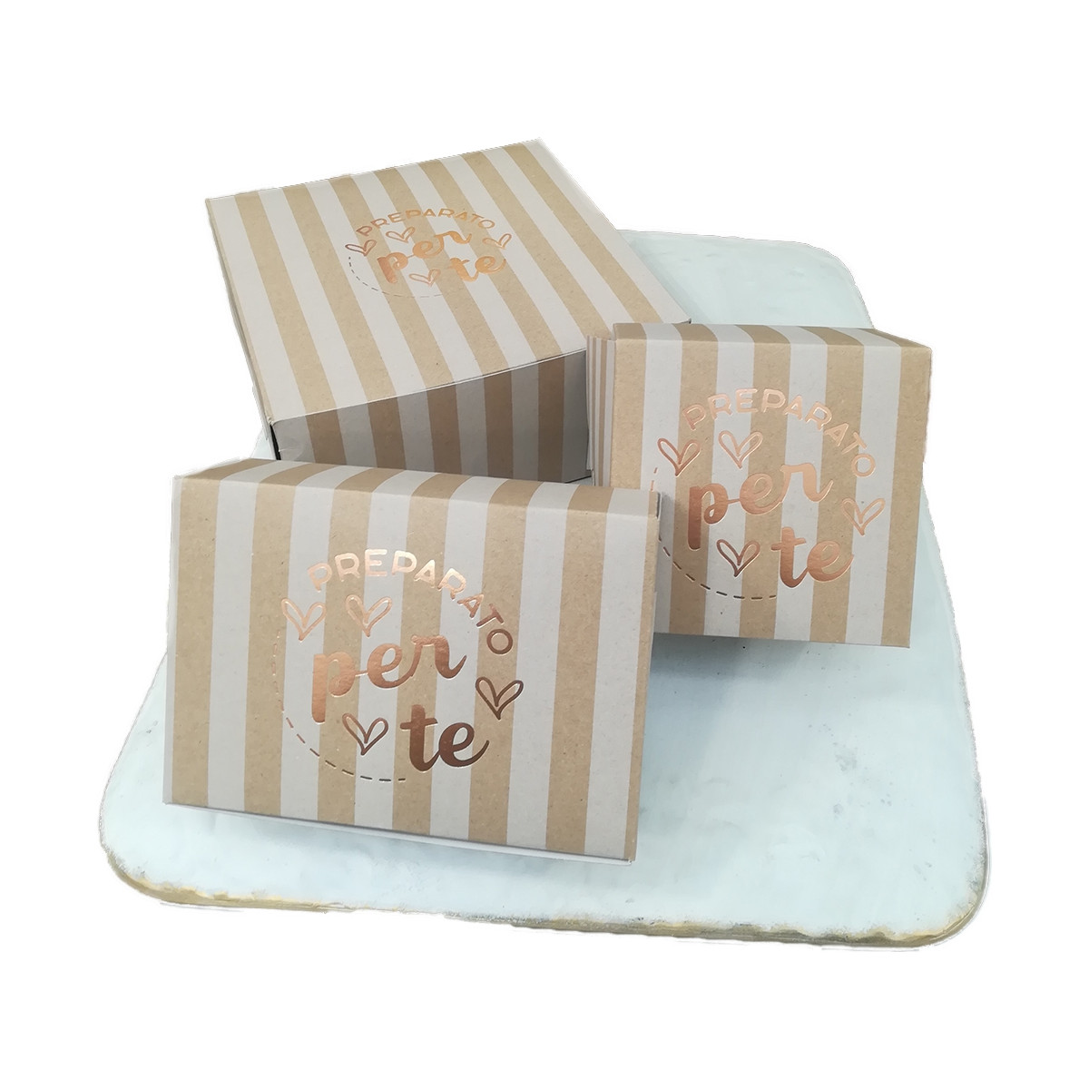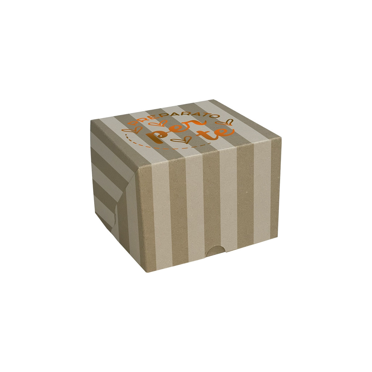 Scatole della linea esclusiva Incartare "Preparato per Te". Fantasia righe verticali marroni e beige. Disponibili in diversi formati e dimensioni: monoporzione dama, scrigno e dama tradizionale.