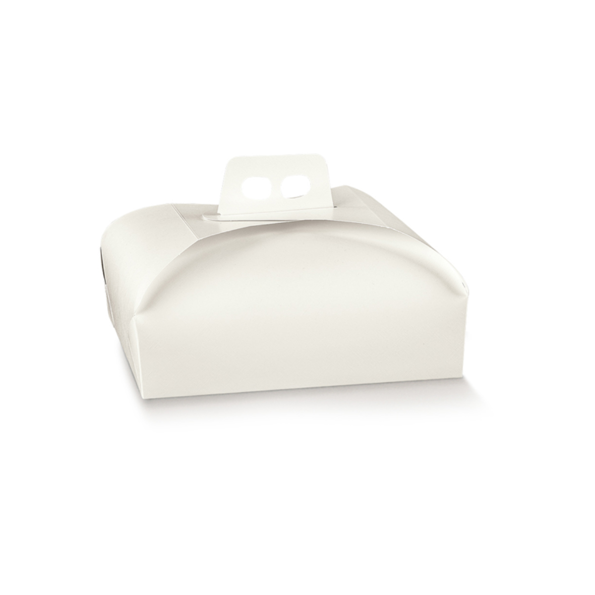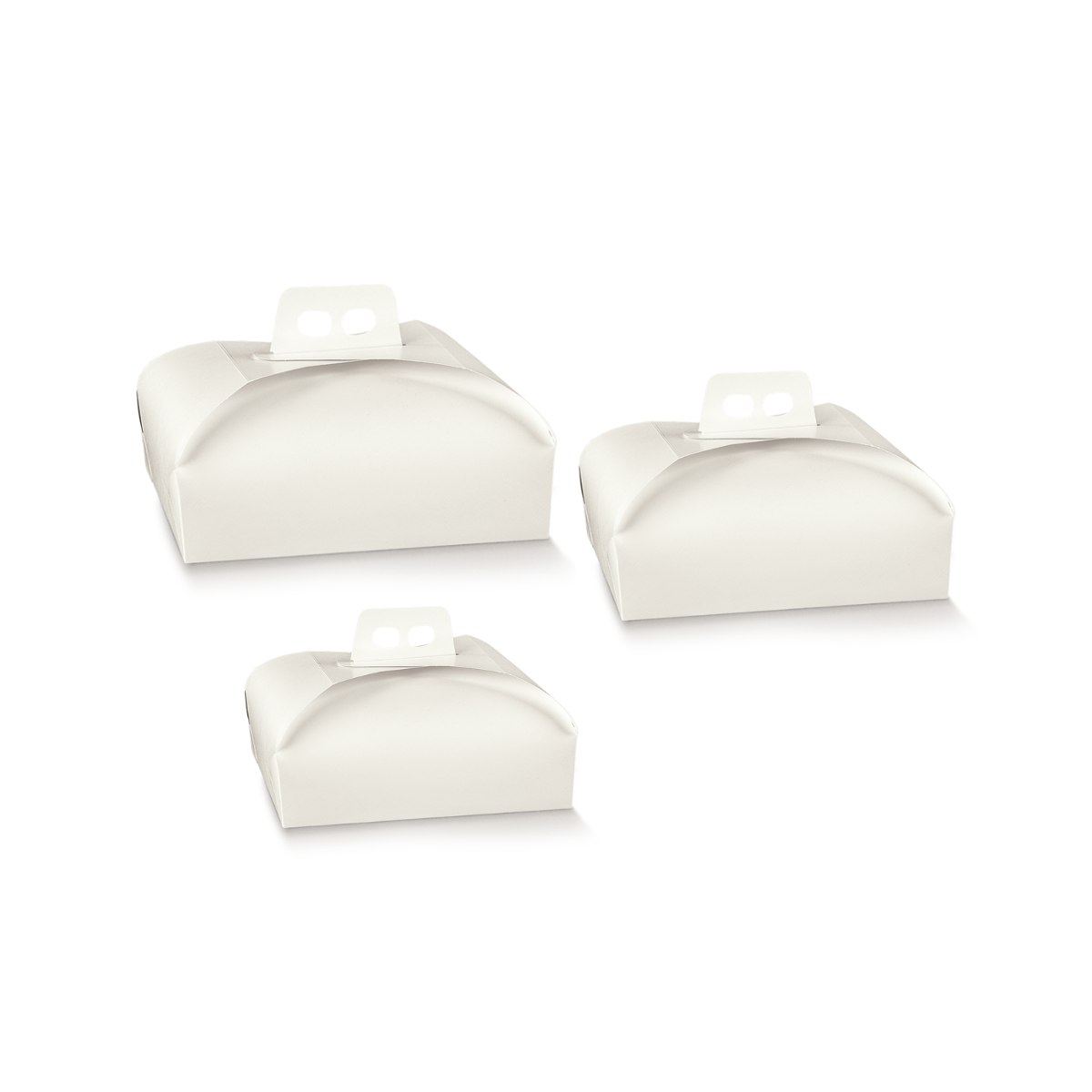 Scatole per torta con base quadra e manico per il trasporto. Le misure sono da intendersi base x profondità x altezza e sono riferite all'esterno della scatola. Prodotto made in Italy.