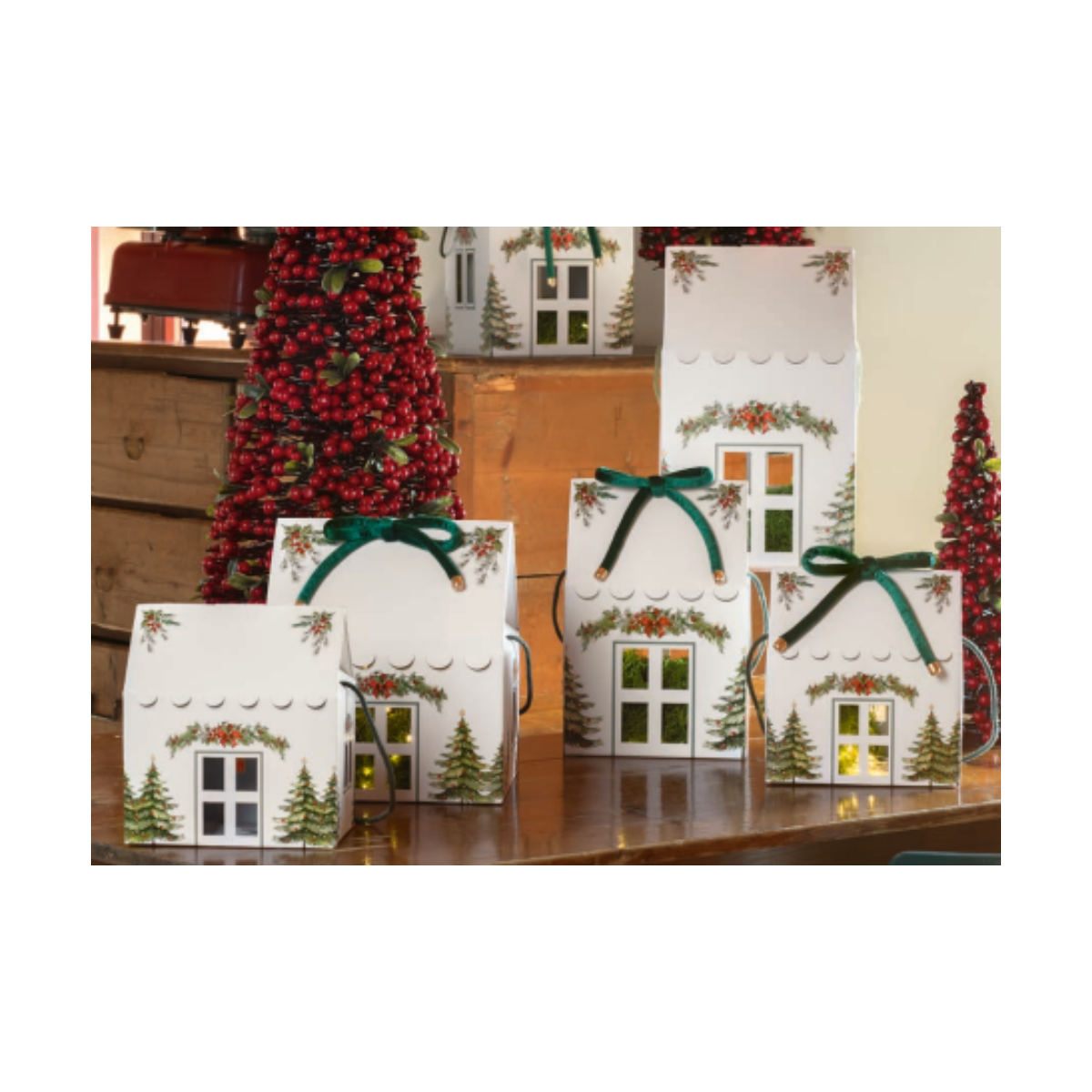 Scatole porta panettone a forma di casetta natalizia, con cordini abbinati. Ideale per panettoni da 1Kg.