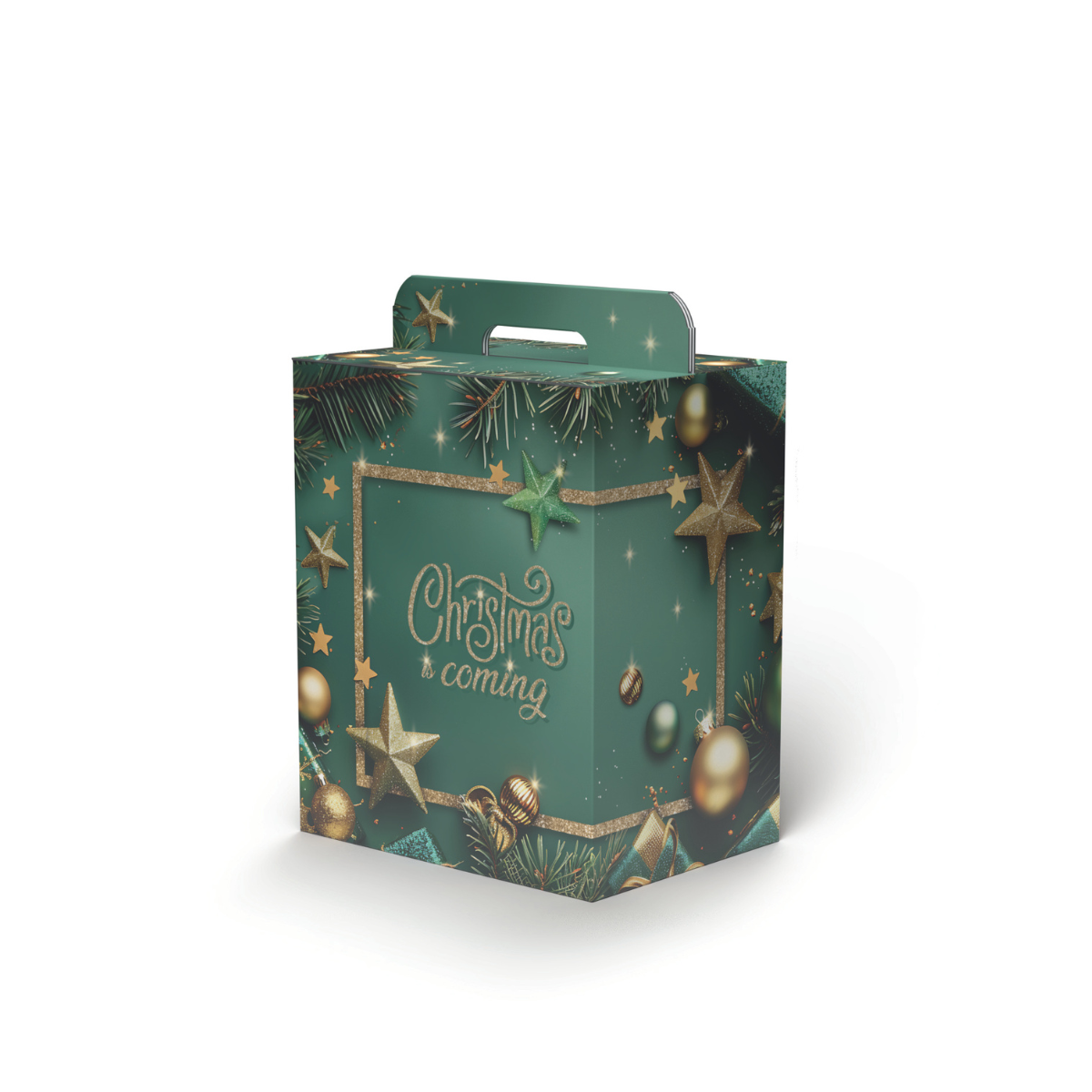 Scatola porta panettone e bottiglia in cartoncino fantasia natalizia Starlight con fondo verde. Dispone di una comoda maniglia superiore per il trasporto. Le misure sono espresse in mm e sono da intendersi base x profondità x altezza e si riferiscono all'esterno del contenitore.